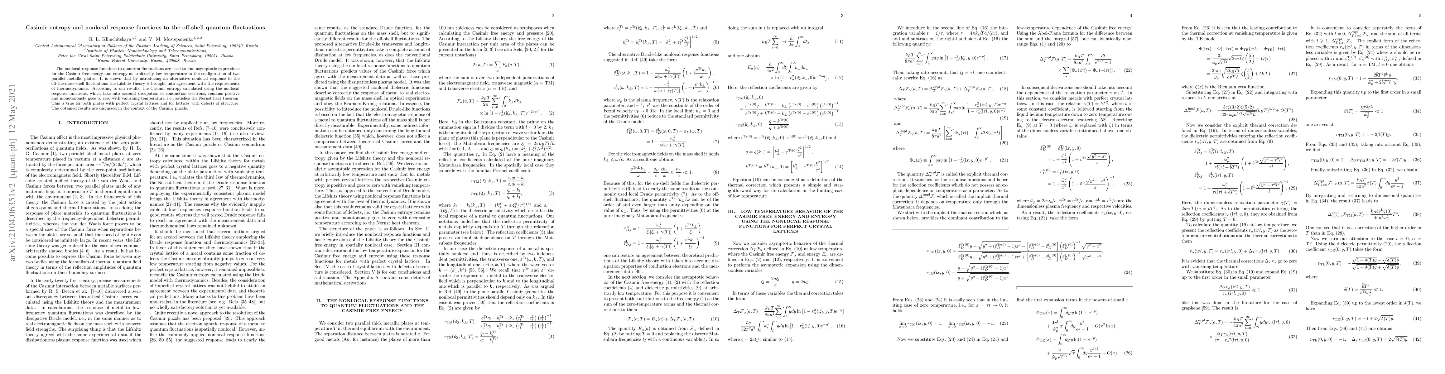 The paper investigates the Casimir entropy using nonlocal response functions for quantum fluctuations, showing that it remains positive and decreases to zero with temperature, aligning with the Nernst heat theorem. This approach reconciles Lifshitz theory with thermodynamic requirements and addresses the Casimir puzzle.