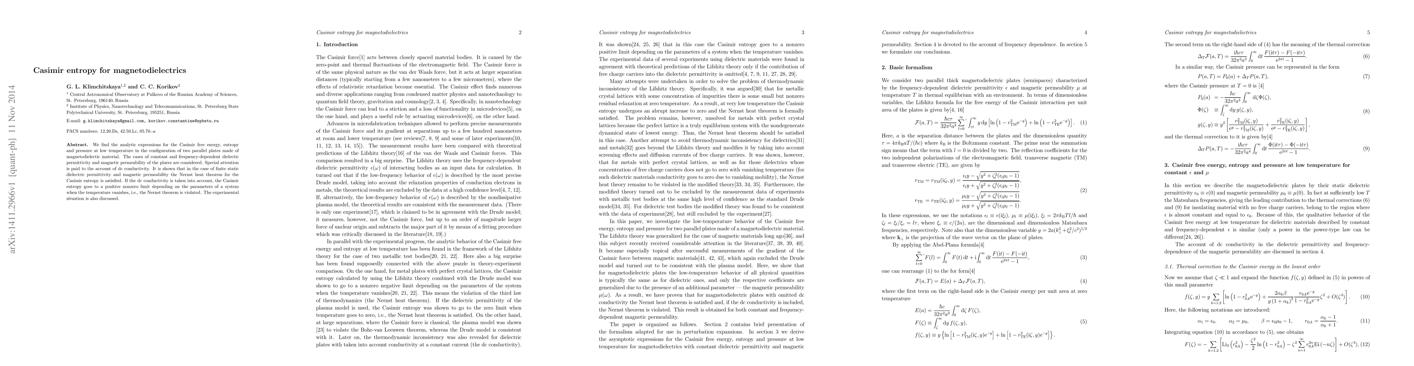 We find the analytic expressions for the Casimir free energy, entropy and pressure at low temperature in the configuration of two parallel plates made of magnetodielectic material. The cases of constant and frequency-dependent dielectic permittivity and magnetic permeability of the plates are considered. Special attention is paid to the account of dc conductivity. It is shown that in the case of finite static dielectric permittivity and magnetic permeability the Nernst heat theorem for the Casimir entropy is satisfied. If the dc conductivity is taken into account, the Casimir entropy goes to a positive nonzero limit depending on the parameters of a system when the temperature vanishes, i.e., the Nernst theorem is violated. The experimental situation is also discussed.