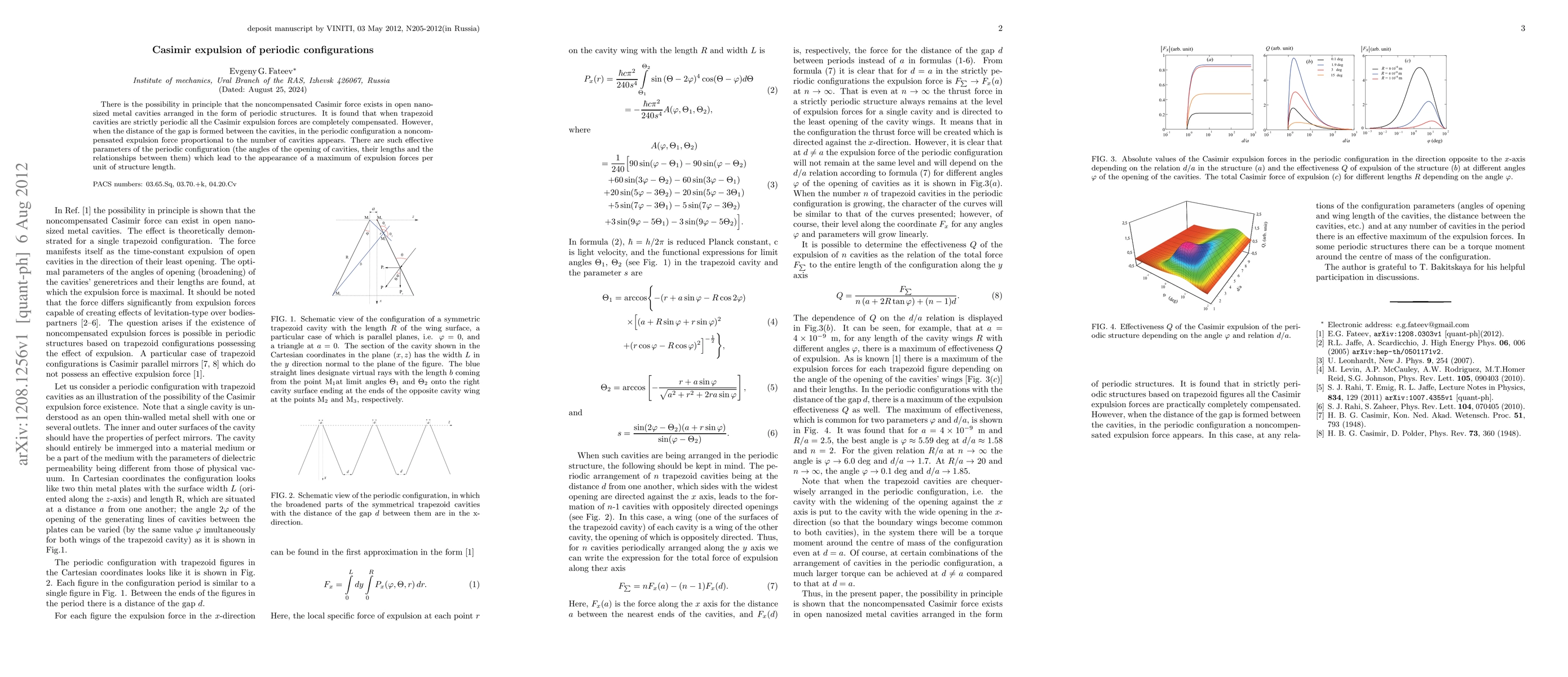 Summary: This study explores the Casimir expulsion forces in periodically arranged nanosized metal cavities, finding that strictly periodic trapezoid cavities completely compensate these forces. However, gaps between cavities lead to noncompensated forces proportional to the cavity count, with specific configurations maximizing expulsion forces per unit length.