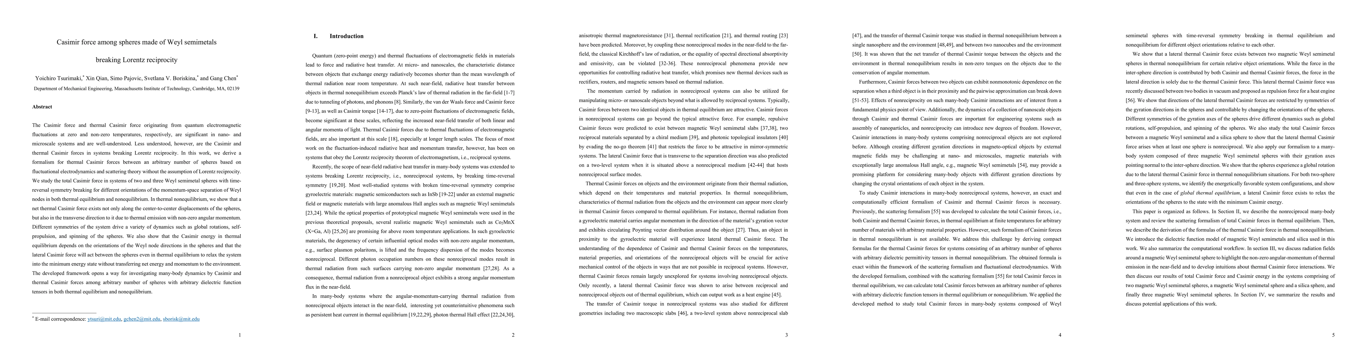 The Casimir force and thermal Casimir force originating from quantum electromagnetic fluctuations at zero and non-zero temperatures, respectively, are significant in nano- and microscale systems and are well-understood. Less understood, however, are the Casimir and thermal Casimir forces in systems breaking Lorentz reciprocity. In this work, we derive a formalism for thermal Casimir forces between an arbitrary number of spheres based on fluctuational electrodynamics and scattering theory without the assumption of Lorentz reciprocity. We study the total Casimir force in systems of two and three Weyl semimetal spheres with time-reversal symmetry breaking for different orientations of the momentum-space separation of Weyl nodes in both thermal equilibrium and nonequilibrium. In thermal nonequilibrium, we show that a net thermal Casimir force exists not only along the center-to-center displacements of the spheres, but also in the transverse direction to it due to thermal emission with non-zero angular momentum. Different symmetries of the system drive a variety of dynamics such as global rotations, self-propulsion, and spinning of the spheres. We also show that the Casimir energy in thermal equilibrium depends on the orientations of the Weyl node directions in the spheres and that the lateral Casimir force will act between the spheres even in thermal equilibrium to relax the system into the minimum energy state without transferring net energy and momentum to the environment. The developed framework opens a way for investigating many-body dynamics by Casimir and thermal Casimir forces among arbitrary number of spheres with arbitrary dielectric function tensors in both thermal equilibrium and nonequilibrium.