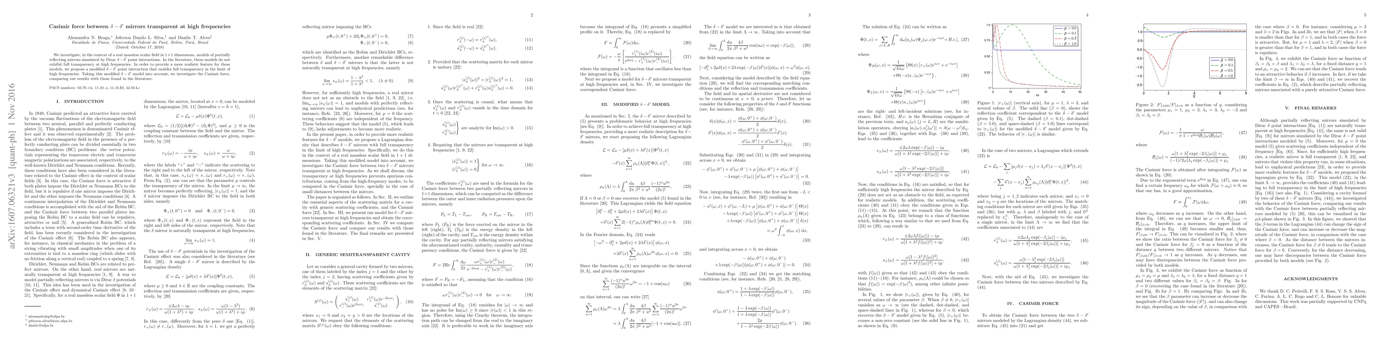 This paper proposes a modified $\delta-\delta^{\prime}$ point interaction to achieve full transparency at high frequencies for partially reflecting mirrors in a $1+1$ dimensional scalar field model, and investigates the resulting Casimir force, comparing its findings with existing literature.