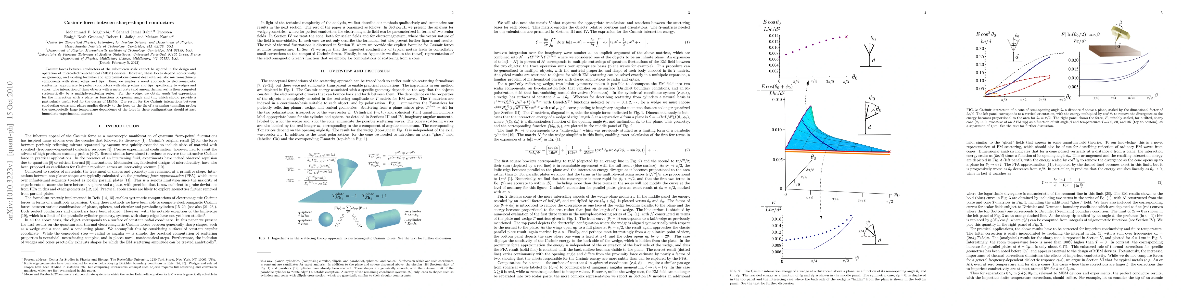 This paper develops a novel approach to calculate Casimir forces between sharp-shaped conductors, such as wedges and cones, using electromagnetic scattering. Analytical expressions for the interaction between wedges and plates are derived, providing valuable insights for MEM device design.