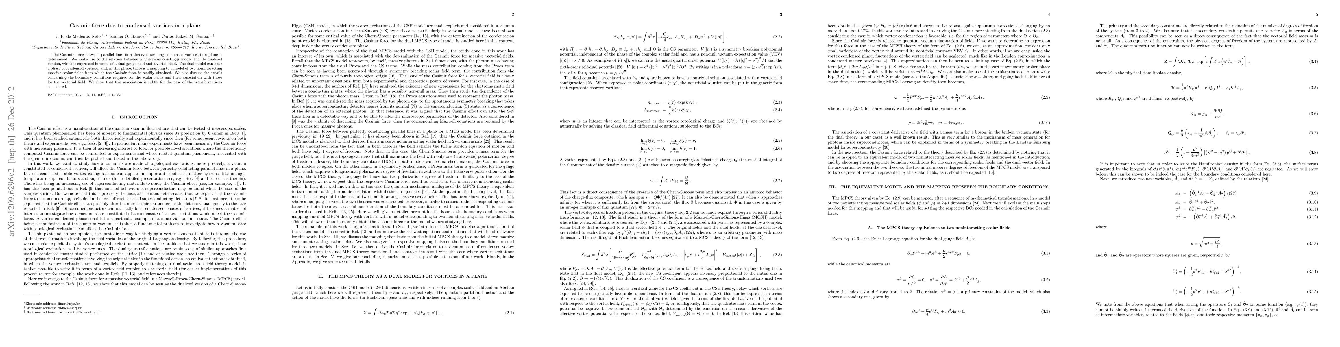 The Casimir force between parallel lines in a theory describing condensed vortices in a plane is determined. We make use of the relation between a Chern-Simons-Higgs model and its dualized version, which is expressed in terms of a dual gauge field and a vortex field. The dual model can have a phase of condensed vortices and, in this phase, there is a mapping to a model of two non-interacting massive scalar fields from which the Casimir force can readily be obtained. The choice of boundary conditions required for the mapped scalar fields and their association with those for the vectorial field and the issues involved are discussed. We also briefly discuss the implications of our results for experiments related to the Casimir effect when vortices can be present.