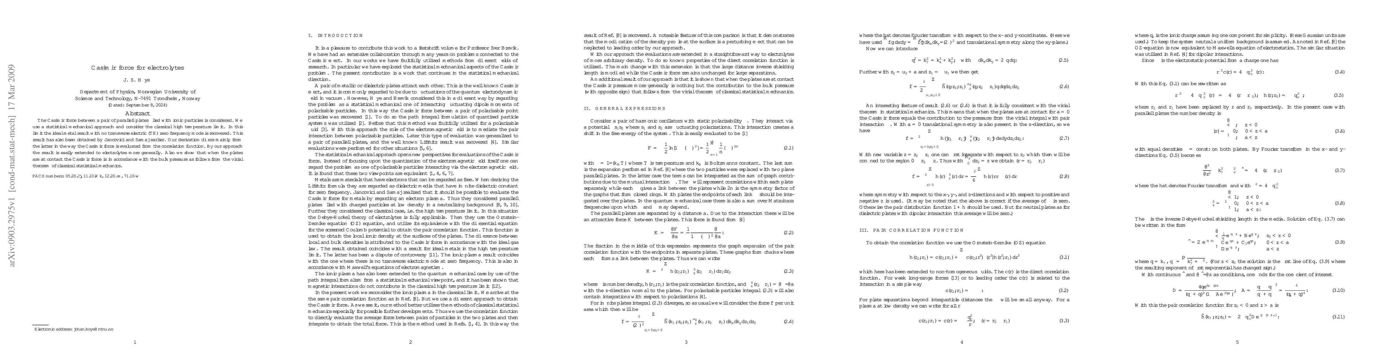 The research employs a statistical mechanical approach in the classical high-temperature limit, deriving the Casimir force for electrolytes using a pair correlation function and extending the evaluation to more general electrolytes.