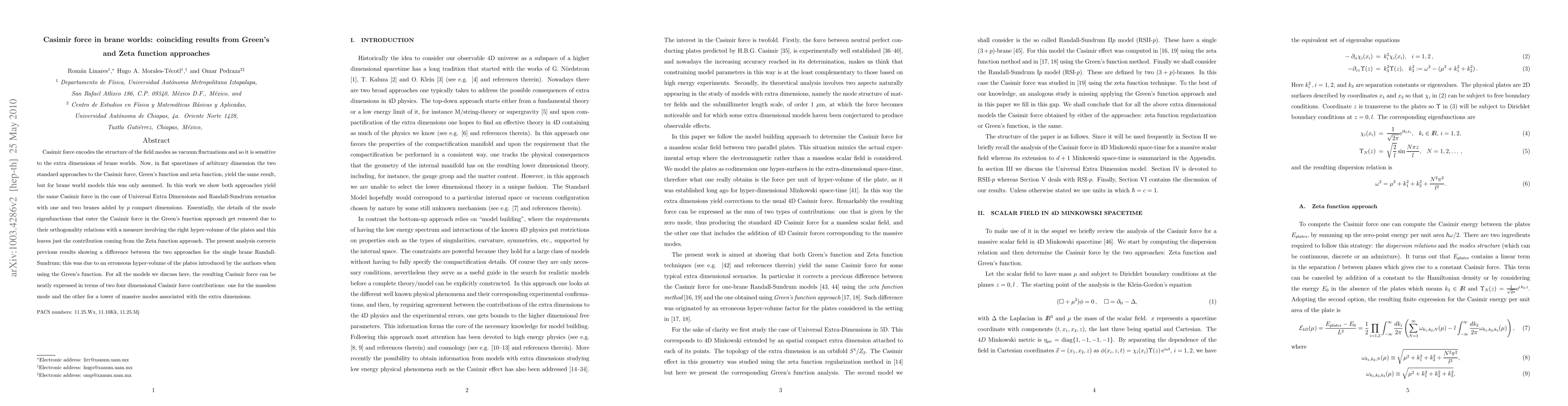 This paper demonstrates that both Green's function and zeta function approaches yield identical Casimir force results in brane world models, correcting previous discrepancies due to an error in the hyper-volume. The Casimir force is expressed in terms of four-dimensional contributions from massless and massive modes.