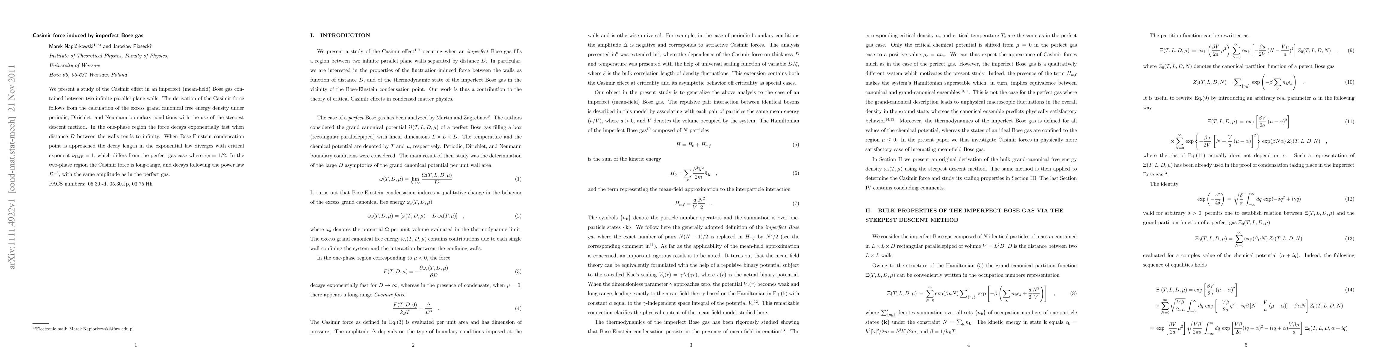 We present a study of the Casimir effect in an imperfect (mean-field) Bose gas contained between two infinite parallel plane walls. The derivation of the Casimir force follows from the calculation of the excess grand canonical free energy density under periodic, Dirichlet, and Neumann boundary conditions with the use of the steepest descent method. In the one-phase region the force decays exponentially fast when distance $D$ between the walls tends to infinity. When Bose-Einstein condensation point is approached the decay length in the exponential law diverges with critical exponent $\nu_{IMP}=1$, which differs from the perfect gas case where $\nu_{P}=1/2$. In the two-phase region the Casimir force is long-range, and decays following the power law $D^{-3}$, with the same amplitude as in the perfect gas.