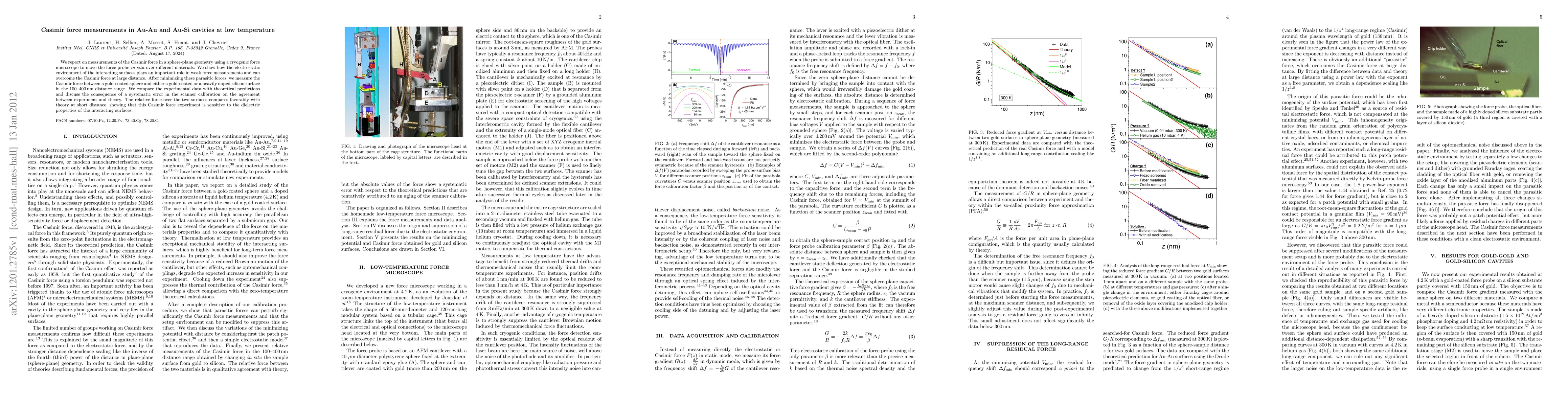 This study measures the Casimir force between gold and gold or gold and silicon surfaces using a cryogenic force microscope, highlighting the influence of electrostatic environment on weak forces. The experiment reveals good agreement with theory at short distances, indicating sensitivity to the dielectric properties of the materials.