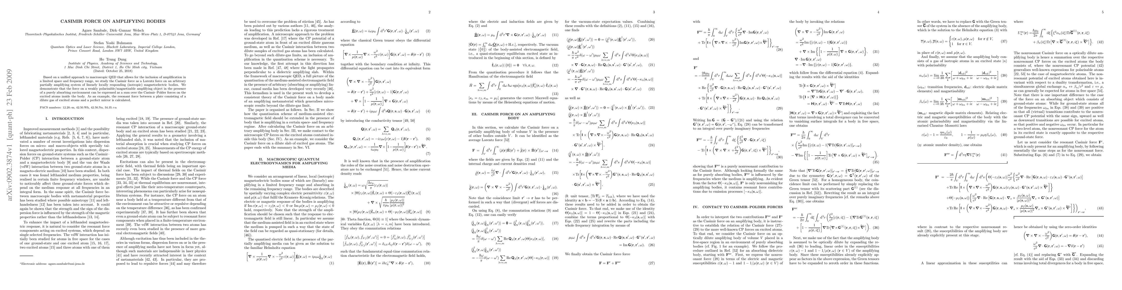 This paper explores the Casimir force on amplifying bodies using a unified macroscopic QED approach, demonstrating that the force can be expressed as a sum of Casimir-Polder forces on excited atoms within the body. An example calculation is provided for the resonant force between a plate of excited atoms and a perfect mirror.