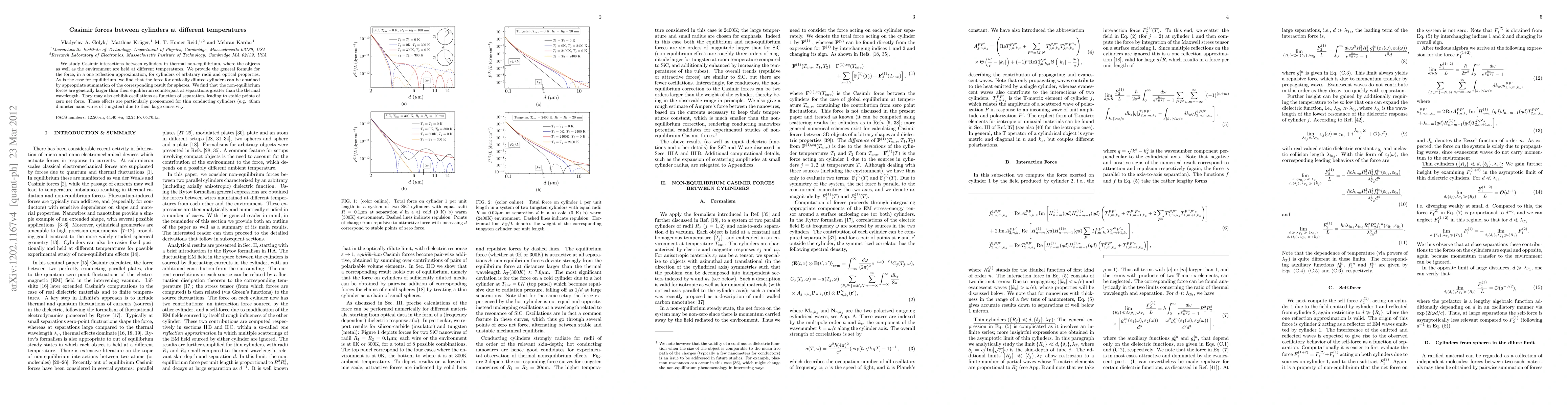 This paper investigates Casimir forces between cylinders in thermal non-equilibrium, deriving a general formula for the force under one reflection approximation. It finds that non-equilibrium forces are generally larger than equilibrium forces at separations greater than the thermal wavelength, especially for thin conducting cylinders like tungsten nano-wires.