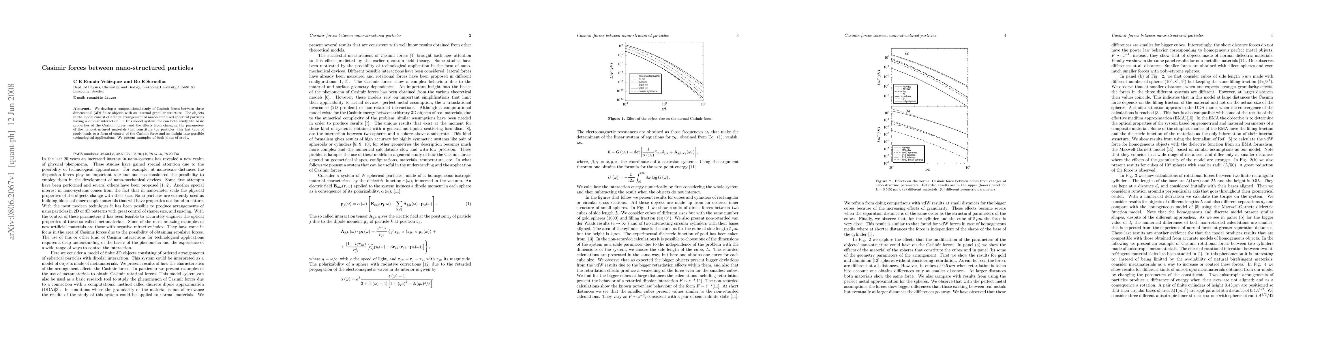 This paper investigates the Casimir forces between 3D nano-structured particles using a computational model, focusing on granular arrangements of spherical particles with dipolar interactions. The study explores both fundamental properties of Casimir forces and the influence of varying nano-material parameters, offering insights into potential technological applications.