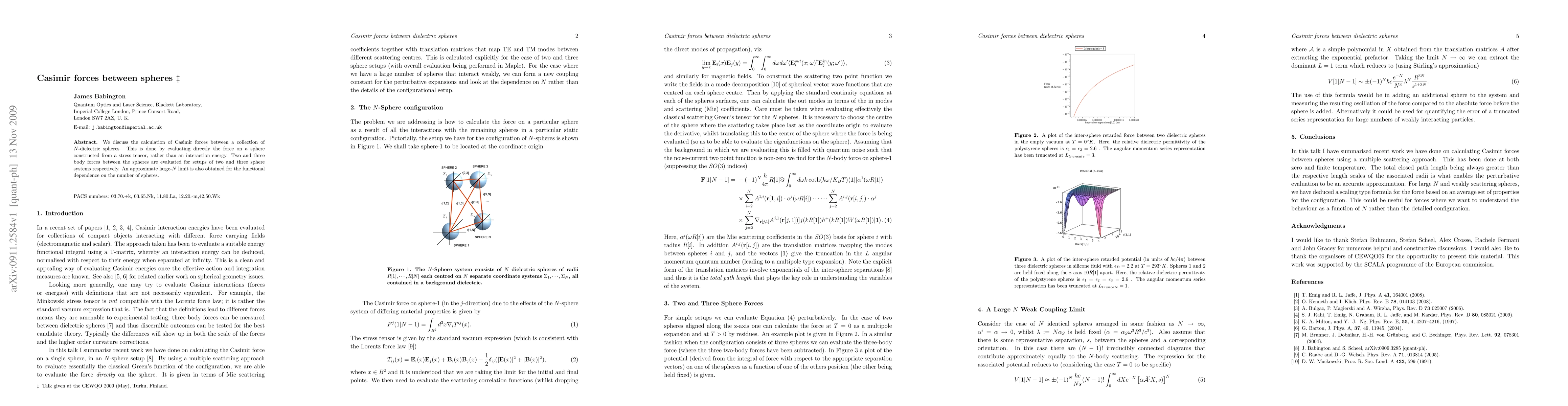 We discuss the calculation of Casimir forces between a collection of $N$-dielectric spheres. This is done by evaluating directly the force on a sphere constructed from a stress tensor, rather than an interaction energy. Two and three body forces between the spheres are evaluated for setups of two and three sphere systems respectively. An approximate large-$N$ limit is also obtained for the functional dependence on the number of spheres.