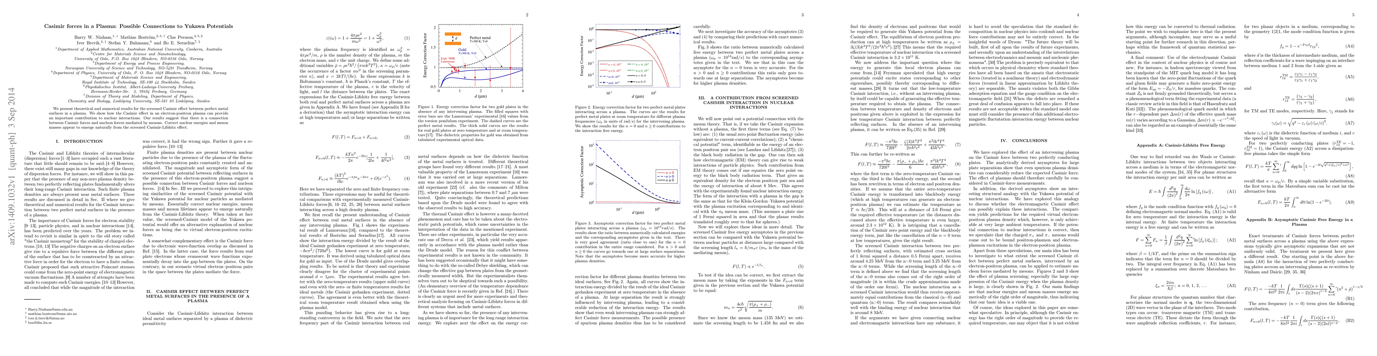 We present theoretical and numerical results for the screened Casimir effect between perfect metal surfaces in a plasma. We show how the Casimir effect in an electron-positron plasma can provide an important contribution to nuclear interactions. Our results suggest that there is a connection between Casimir forces and nucleon forces mediated by mesons. Correct nuclear energies and meson masses appear to emerge naturally from the screened Casimir-Lifshitz effect.