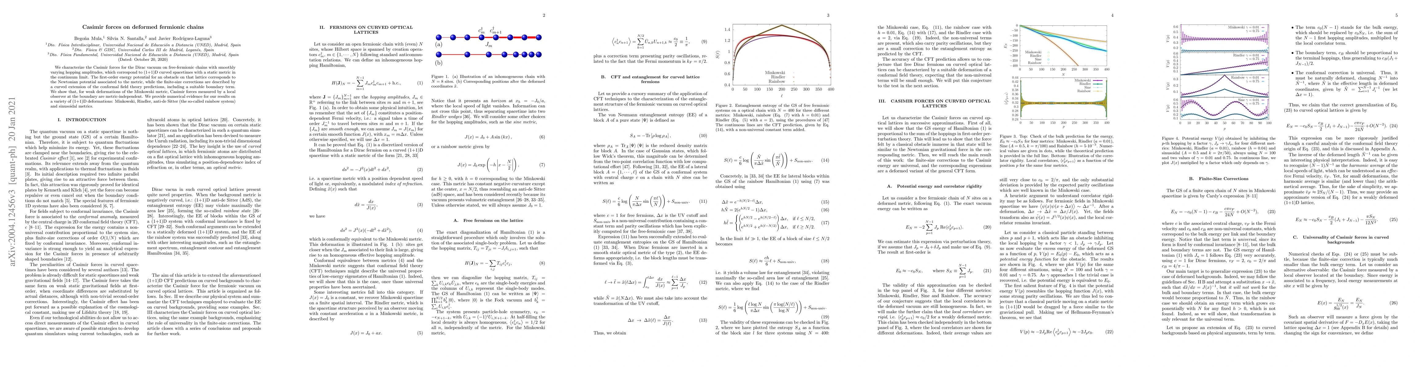 We characterize the Casimir forces for the Dirac vacuum on free-fermionic chains with smoothly varying hopping amplitudes, which correspond to (1+1)D curved spacetimes with a static metric in the continuum limit. The first-order energy potential for an obstacle on that lattice corresponds to the Newtonian potential associated to the metric, while the finite-size corrections are described by a curved extension of the conformal field theory predictions, including a suitable boundary term. We show that, for weak deformations of the Minkowski metric, Casimir forces measured by a local observer at the boundary are metric-independent. We provide numerical evidence for our results on a variety of (1+1)D deformations: Minkowski, Rindler, anti-de Sitter (the so-called rainbow system) and sinusoidal metrics.