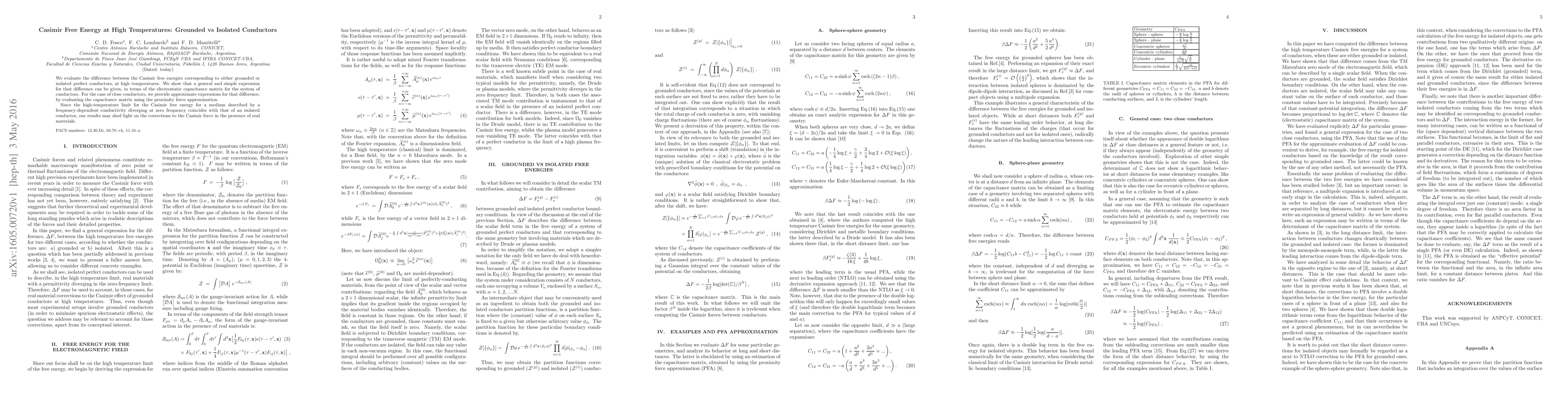This paper evaluates the difference in Casimir free energies between grounded and isolated perfect conductors at high temperatures, showing a simple expression in terms of the electrostatic capacitance matrix. It provides approximate expressions for close conductors using the proximity force approximation and discusses implications for corrections to the Casimir force in real materials.