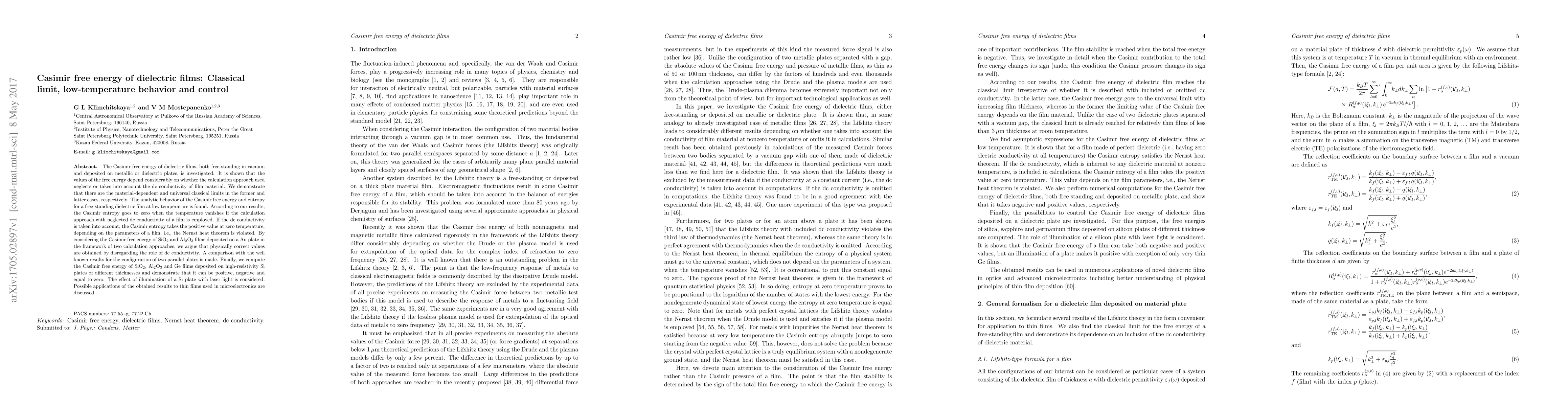 This paper investigates the Casimir free energy of dielectric films, showing that its values depend on whether the dc conductivity of the film material is considered. It finds material-dependent classical limits when dc conductivity is neglected, while universal classical limits apply when it is included. The study also reveals that the Casimir entropy vanishes at zero temperature without considering dc conductivity, but remains positive with it, violating the Nernst heat theorem.