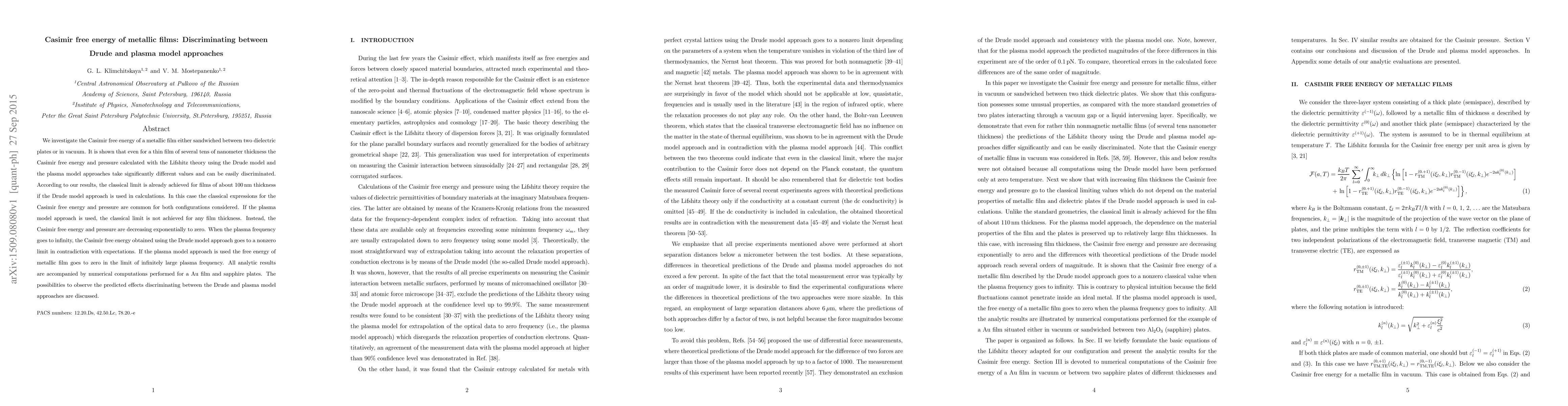 This paper investigates the Casimir free energy of metallic films using the Drude and plasma model approaches, showing significant differences in results. The Drude model achieves classical limits for films around 100 nm, while the plasma model shows an exponential decay to zero, with implications for experimental observations.
