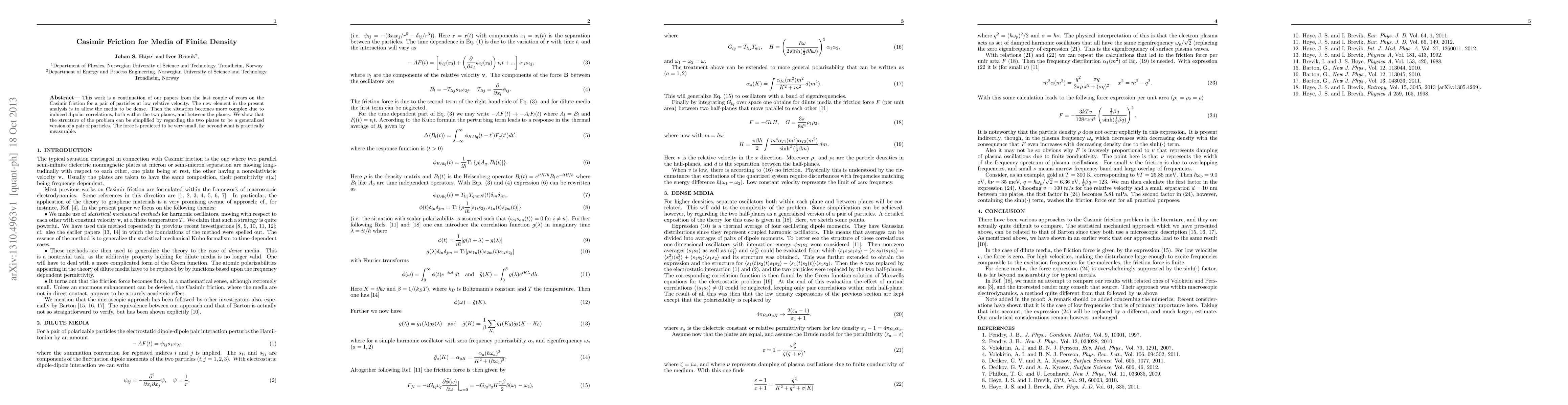 This work is a continuation of our papers from the last couple of years on the Casimir friction for a pair of particles at low relative velocity. The new element in the present analysis is to allow the media to be dense. Then the situation becomes more complex due to induced dipolar correlations, both within the two planes, and between the planes. We show that the structure of the problem can be simplified by regarding the two plates to be a generalized version of a pair of particles. The force is predicted to be very small, far beyond what is practically measurable.