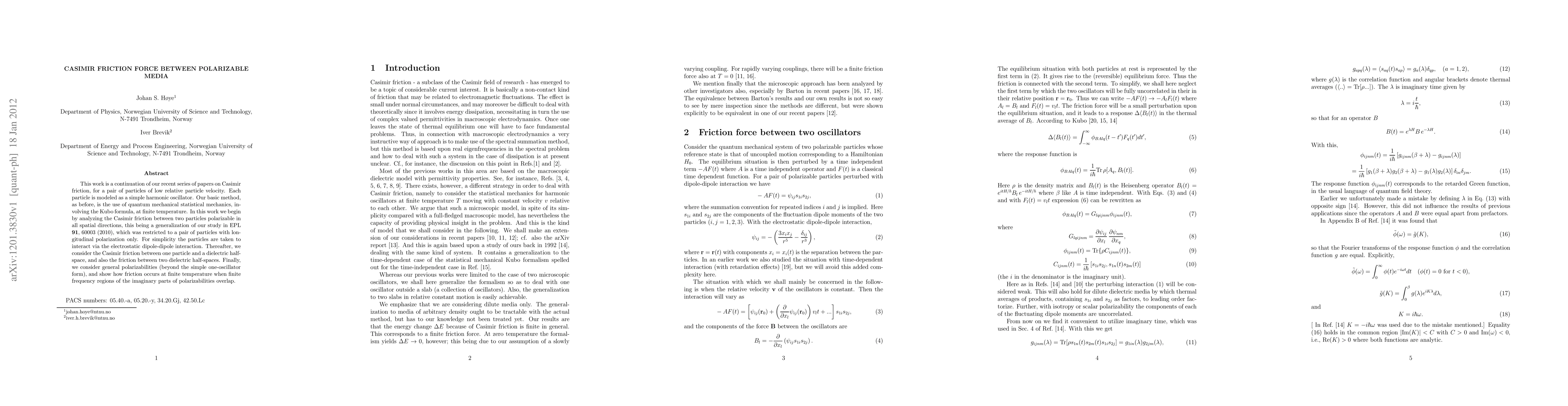 This work is a continuation of our recent series of papers on Casimir friction, for a pair of particles of low relative particle velocity. Each particle is modeled as a simple harmonic oscillator. Our basic method, as before, is the use of quantum mechanical statistical mechanics, involving the Kubo formula, at finite temperature. In this work we begin by analyzing the Casimir friction between two particles polarizable in all spatial directions, this being a generalization of our study in EPL 91, 60003 (2010), which was restricted to a pair of particles with longitudinal polarization only. For simplicity the particles are taken to interact via the electrostatic dipole-dipole interaction. Thereafter, we consider the Casimir friction between one particle and a dielectric half-space, and also the friction between two dielectric half-spaces. Finally, we consider general polarizabilities (beyond the simple one-oscillator form), and show how friction occurs at finite temperature when finite frequency regions of the imaginary parts of polarizabilities overlap.
