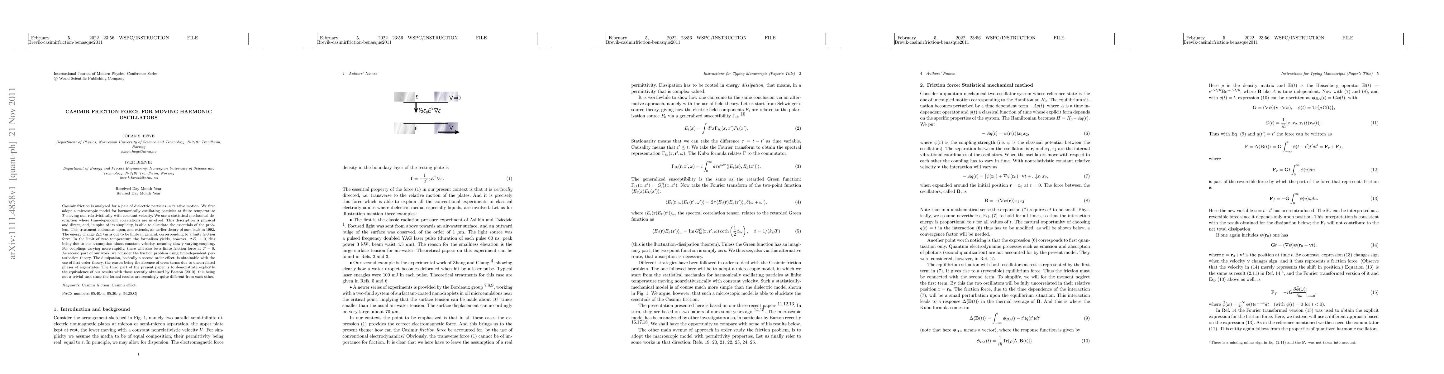 Researchers analyzed Casimir friction force for moving harmonic oscillators, finding a finite friction force even at zero temperature, which depends on the coupling between particles.