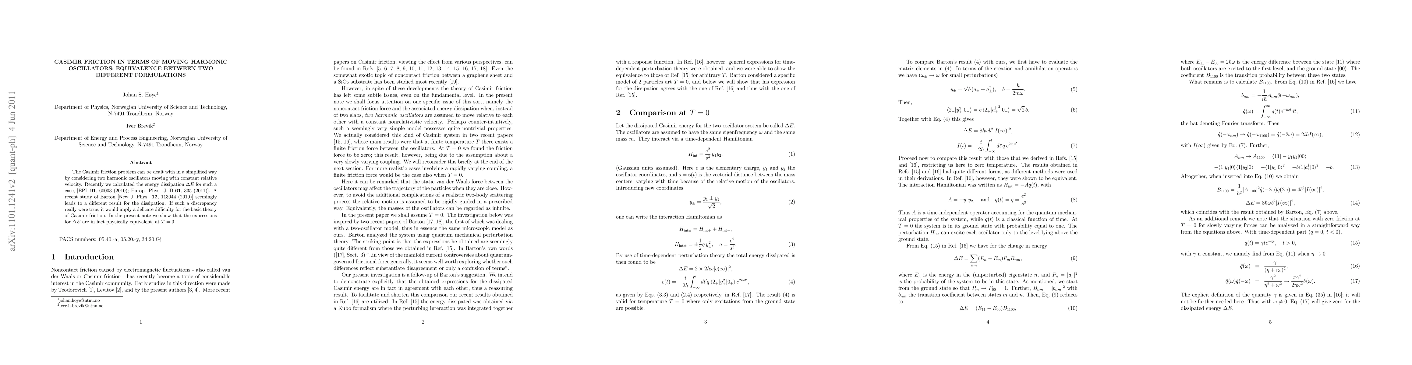 The Casimir friction problem can be dealt with in a simplified way by considering two harmonic oscillators moving with constant relative velocity. Recently we calculated the energy dissipation for such a case, [EPL {\bf 91}, 60003 (2010); Europ. Phys. J. D {\bf 61}, 335 (2011)]. A recent study of Barton [New J. Phys. {\bf 12}, 113044 (2010)] seemingly leads to a different result for the dissipation. If such a discrepancy really were true, it would imply a delicate difficulty for the basic theory of Casimir friction. In the present note we show that the expressions for the dissipation are in fact physically equivalent, at T=0.