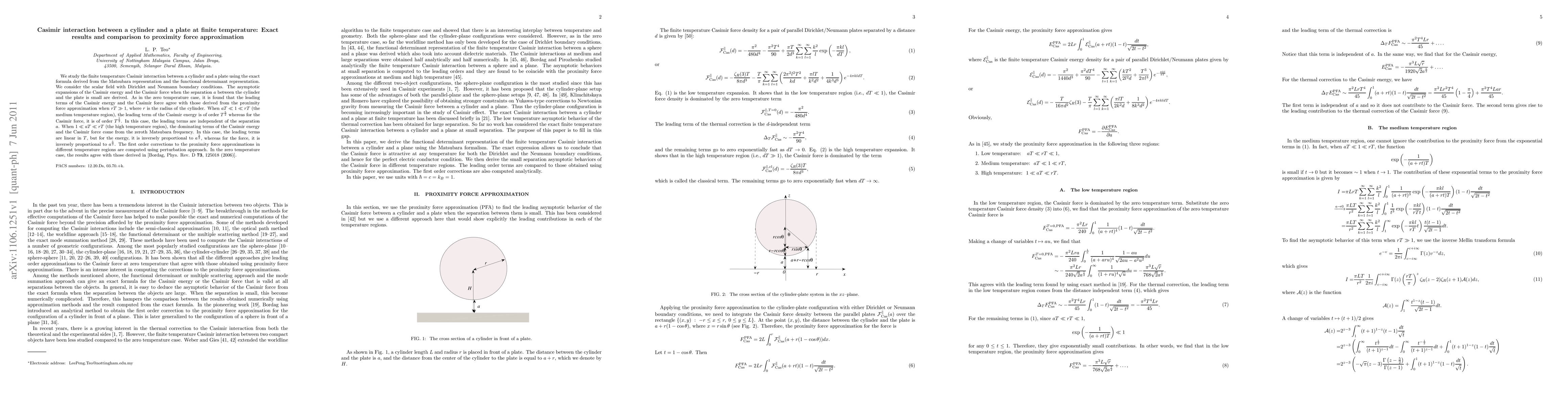 This paper investigates the finite temperature Casimir interaction between a cylinder and a plate, deriving exact results and comparing them to the proximity force approximation. The study reveals that the leading terms of the Casimir energy and force align with the approximation for high temperatures, while in intermediate temperature regions, the leading term of the Casimir energy scales as $T^{5/2}$ and the force as $T^{7/2}$, both independent of the separation.