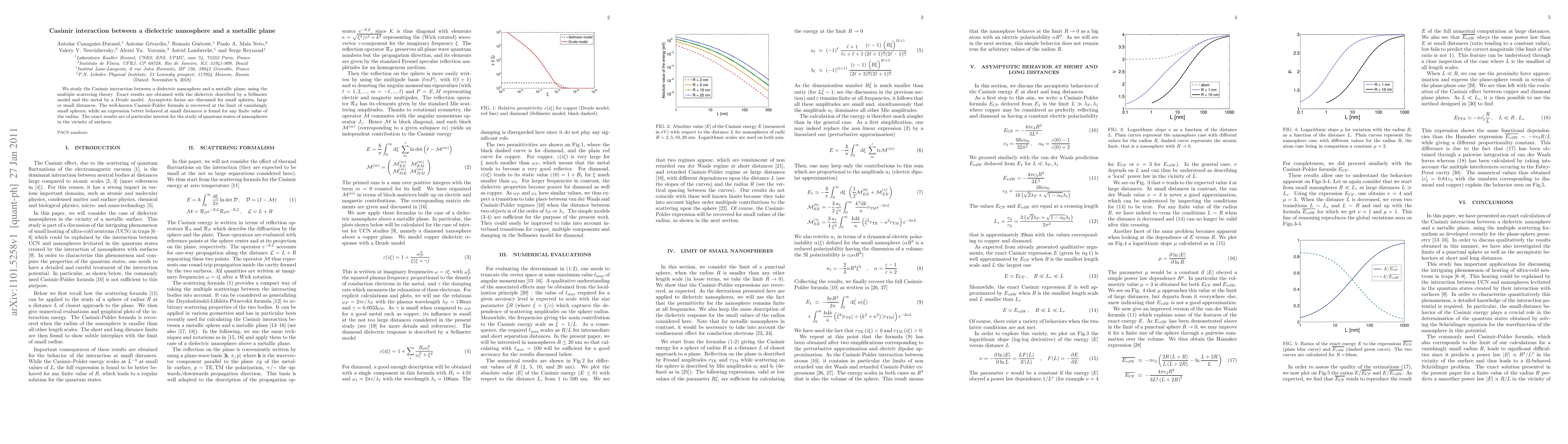 The paper investigates the Casimir interaction between a dielectric nanosphere and a metallic plane using multiple scattering theory, with exact results derived from the Sellmeier and Drude models. The study recovers the Casimir-Polder formula for very small spheres and provides a more stable expression for finite radii, relevant for quantum states of nanospheres near surfaces.