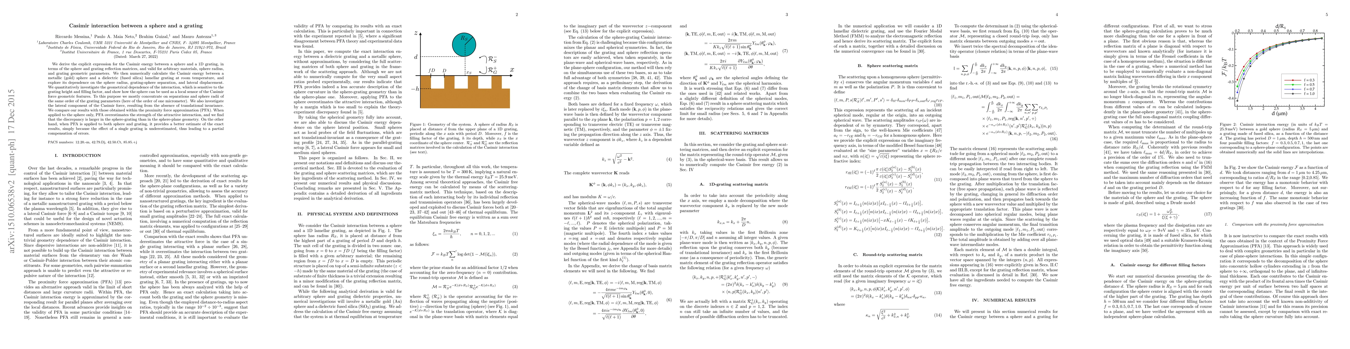 This research derives an explicit expression for the Casimir energy interaction between a sphere and a 1D grating, demonstrating its dependence on various geometric parameters and material properties. The study finds that the proximity force approximation overestimates the interaction strength when applied to a sphere alone but offers a better estimate when applied to both the sphere and the grating.
