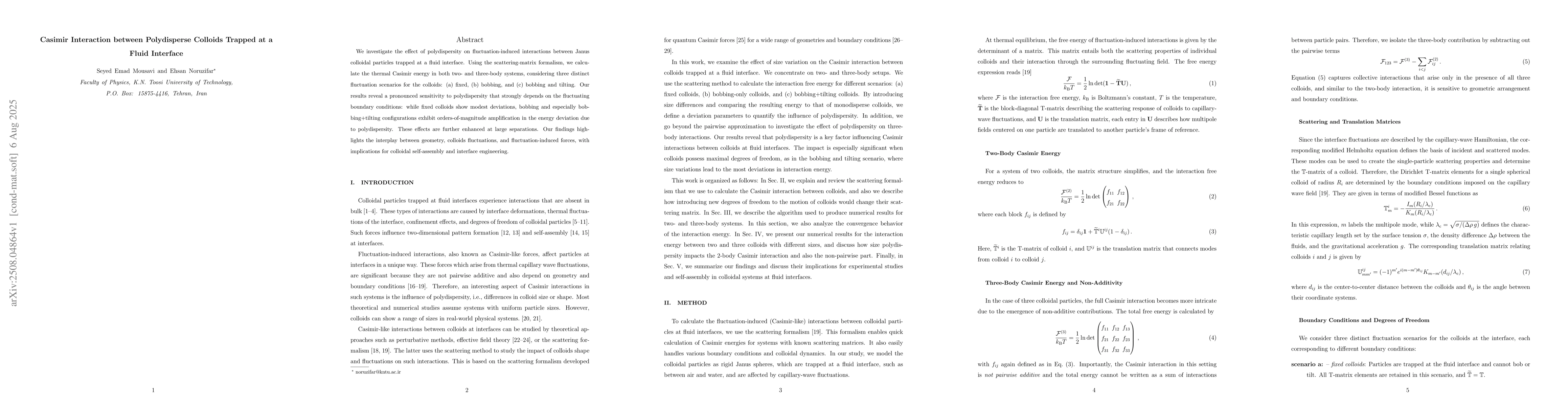 We investigate the effect of polydispersity on fluctuation-induced interactions between Janus colloidal particles trapped at a fluid interface. Using the scattering-matrix formalism, we calculate the thermal Casimir energy in both two- and three-body systems, considering three distinct fluctuation scenarios for the colloids: (a) fixed, (b) bobbing, and (c) bobbing and tilting. Our results reveal a pronounced sensitivity to polydispersity that strongly depends on the fluctuating boundary conditions: while fixed colloids show modest deviations, bobbing and especially bobbing+tilting configurations exhibit orders-of-magnitude amplification in the energy deviation due to polydispersity. These effects are further enhanced at large separations. Our findings highlights the interplay between geometry, colloids fluctuations, and fluctuation-induced forces, with implications for colloidal self-assembly and interface engineering.