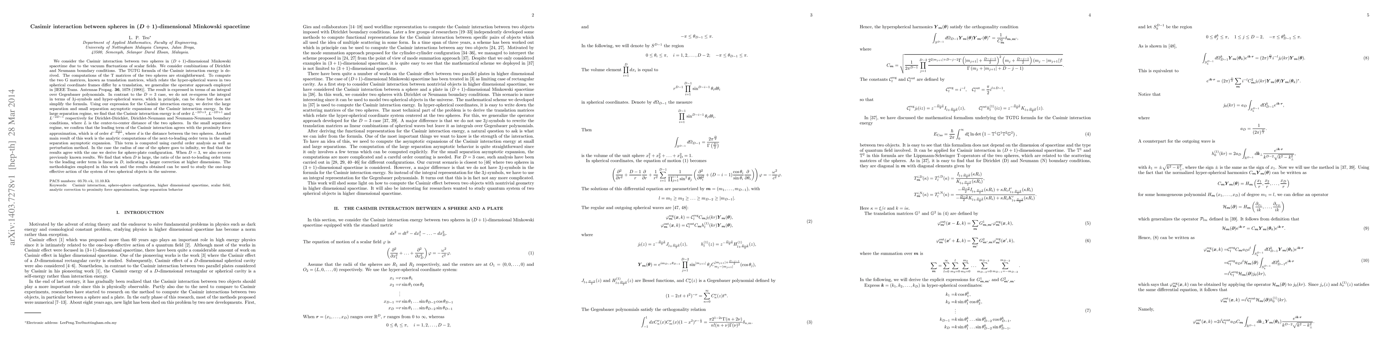 We consider the Casimir interaction between two spheres in $(D+1)$-dimensional Minkowski spacetime due to the vacuum fluctuations of scalar fields. We consider combinations of Dirichlet and Neumann boundary conditions. The TGTG formula of the Casimir interaction energy is derived. The computations of the T matrices of the two spheres are straightforward. To compute the two G matrices, known as translation matrices, which relate the hyper-spherical waves in two spherical coordinate frames differ by a translation, we generalize the operator approach employed in [IEEE Trans. Antennas Propag. \textbf{36}, 1078 (1988)]. The result is expressed in terms of an integral over Gegenbauer polynomials. Using our expression for the Casimir interaction energy, we derive the large separation and small separation asymptotic expansions of the Casimir interaction energy. In the large separation regime, we find that the Casimir interaction energy is of order $L^{-2D+3}$, $L^{-2D+1}$ and $L^{-2D-1}$ respectively for Dirichlet-Dirichlet, Dirichlet-Neumann and Neumann-Neumann boundary conditions, where $L$ is the center-to-center distance of the two spheres. In the small separation regime, we confirm that the leading term of the Casimir interaction agrees with the proximity force approximation, which is of order $d^{-\frac{D+1}{2}}$, where $d$ is the distance between the two spheres. Another main result of this work is the analytic computations of the next-to-leading order term in the small separation asymptotic expansion. This term is computed using careful order analysis as well as perturbation method. We find that when $D$ is large, the ratio of the next-to-leading order term to the leading order term is linear in $D$, indicating a larger correction at higher dimensions.