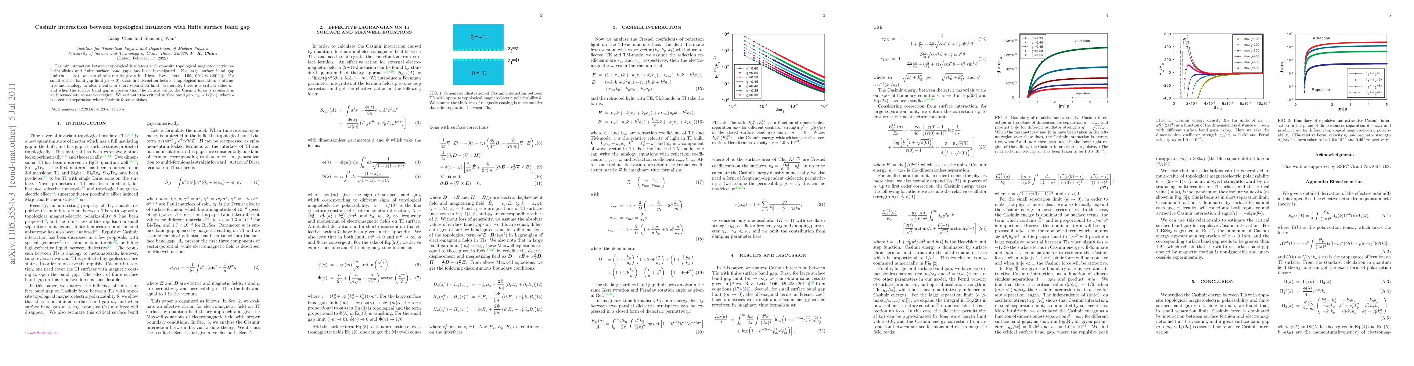 This paper investigates the Casimir interaction between topological insulators with finite surface band gaps, revealing a transition from attractive to repulsive forces depending on the band gap size. For large gaps, the interaction aligns with previous results, while small gaps lead to attractive forces akin to ideal metals.