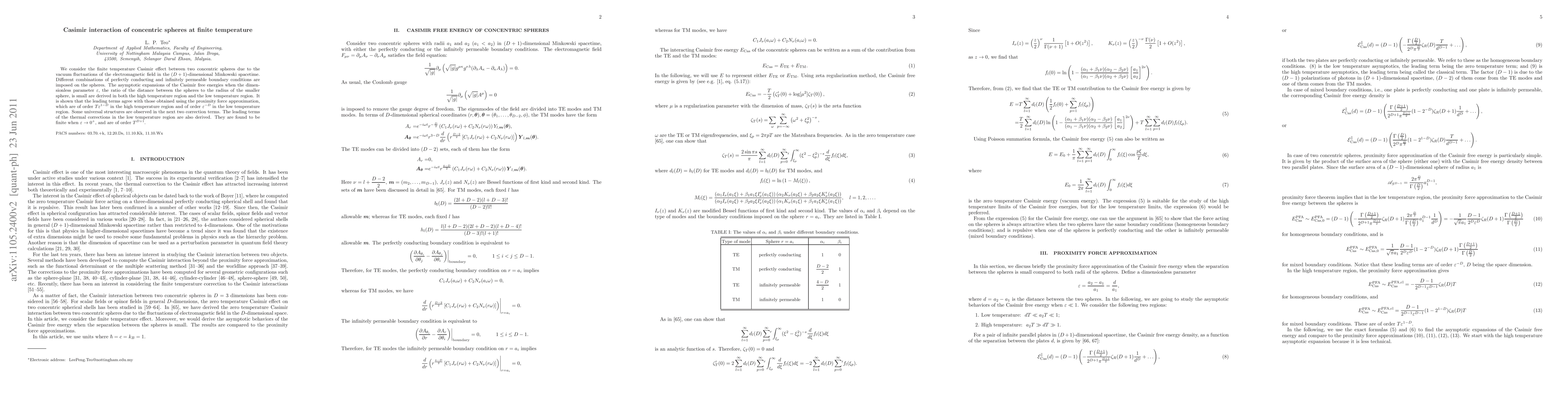 This paper investigates the finite temperature Casimir effect between two concentric spheres in $(D+1)$-dimensional spacetime, deriving asymptotic expansions for the Casimir free energies under various boundary conditions. The leading terms align with the proximity force approximation, revealing universal structures in the next correction terms and finite thermal corrections in the low temperature region.