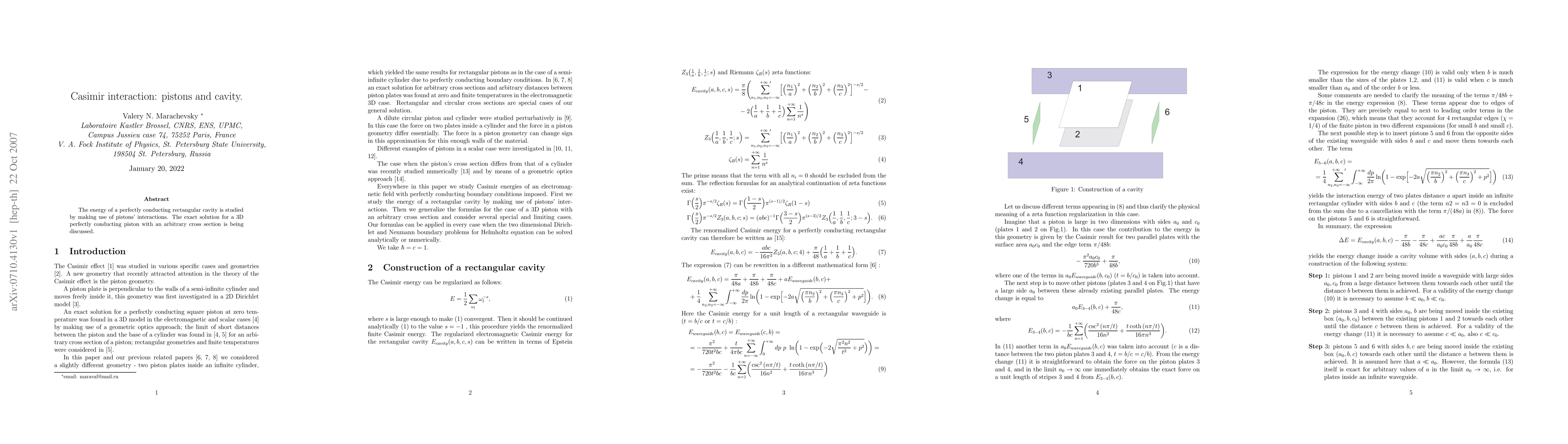 The energy of a perfectly conducting rectangular cavity is studied by making use of pistons' interactions. The exact solution for a 3D perfectly conducting piston with an arbitrary cross section is being discussed.
