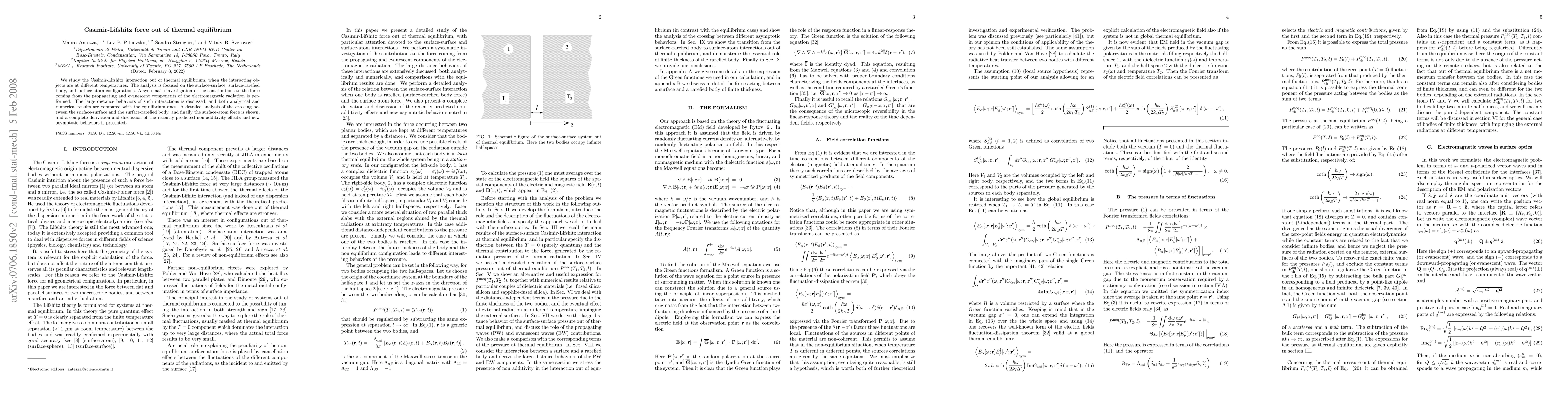 This paper investigates the Casimir-Lifshitz force beyond thermal equilibrium, focusing on surface-surface and surface-atom interactions. It analyzes contributions from electromagnetic radiation components and compares non-equilibrium behaviors with equilibrium ones, revealing new asymptotic behaviors and non-additivity effects.