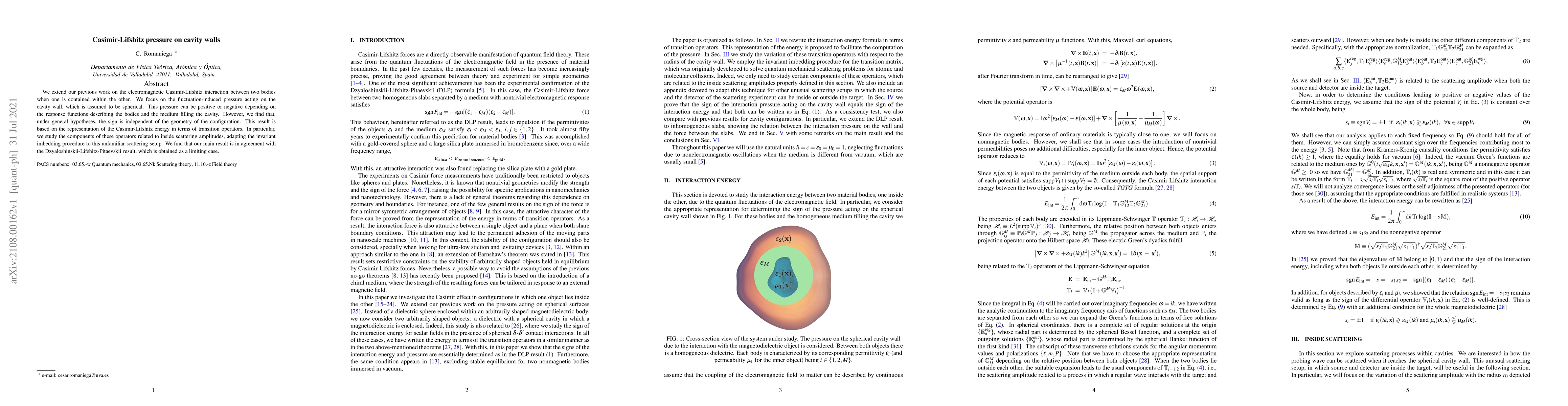 We extend our previous work on the electromagnetic Casimir-Lifshitz interaction between two bodies when one is contained within the other. We focus on the fluctuation-induced pressure acting on the cavity wall, which is assumed to be spherical. This pressure can be positive or negative depending on the response functions describing the bodies and the medium filling the cavity. However, we find that, under general hypotheses, the sign is independent of the geometry of the configuration. This result is based on the representation of the Casimir-Lifshitz energy in terms of transition operators. In particular, we study the components of these operators related to inside scattering amplitudes, adapting the invariant imbedding procedure to this unfamiliar scattering setup. We find that our main result is in agreement with the Dzyaloshinskii-Lifshitz-Pitaevskii result, which is obtained as a limiting case.