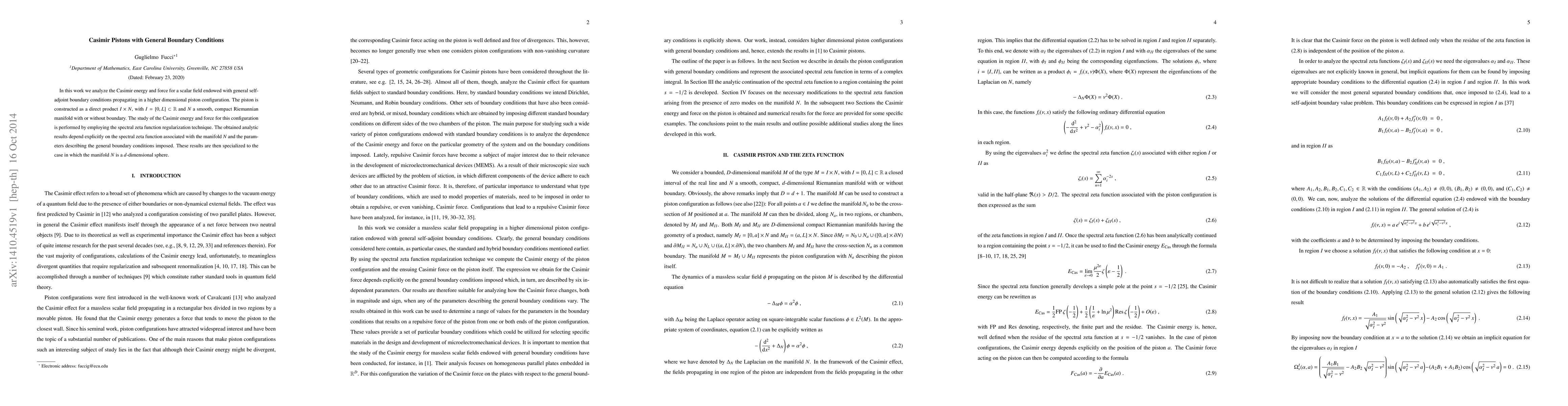 The paper presents a detailed method for calculating Casimir energy and force using spectral zeta function regularization, extending previous works to more general boundary conditions and higher-dimensional piston configurations.