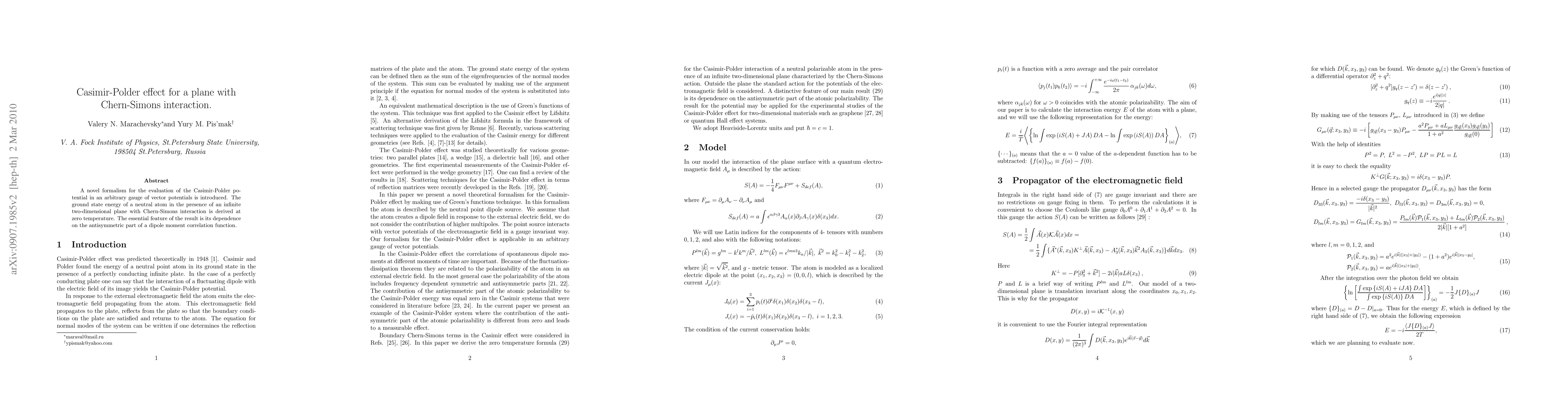 This paper introduces a new formalism to calculate the Casimir-Polder potential in various gauges, deriving the ground state energy of a neutral atom near a plane with Chern-Simons interaction at zero temperature. The result notably depends on the antisymmetric part of a dipole moment correlation function.