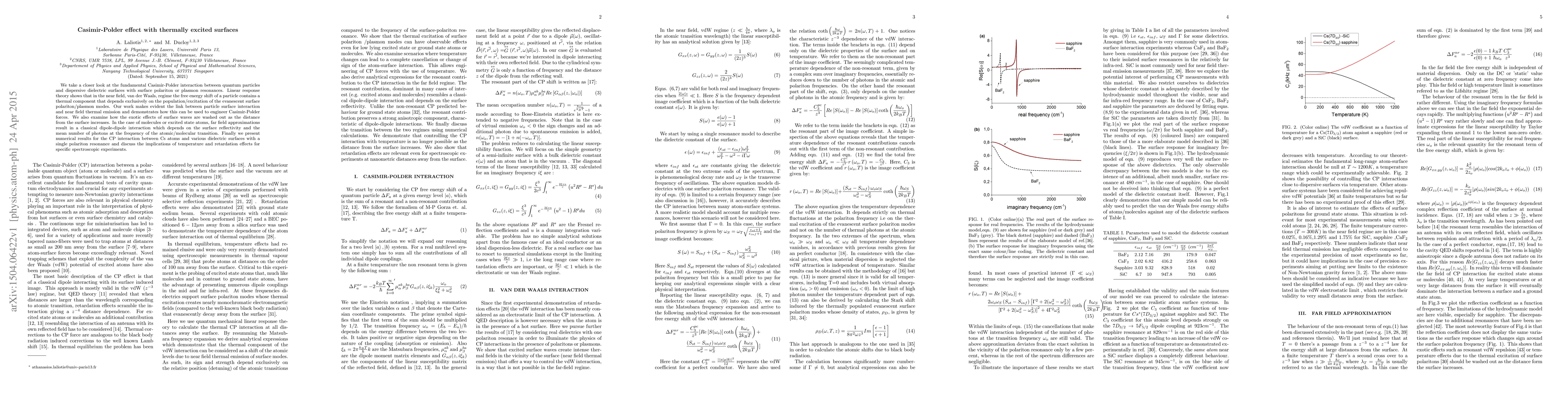 This paper investigates the Casimir-Polder interaction between quantum particles and dispersive dielectric surfaces, revealing a thermal component influenced by surface polariton/plasmon modes. It demonstrates the connection between particle-surface interactions and thermal near-field emission, and explores the diminishing effects of surface waves with increasing distance.
