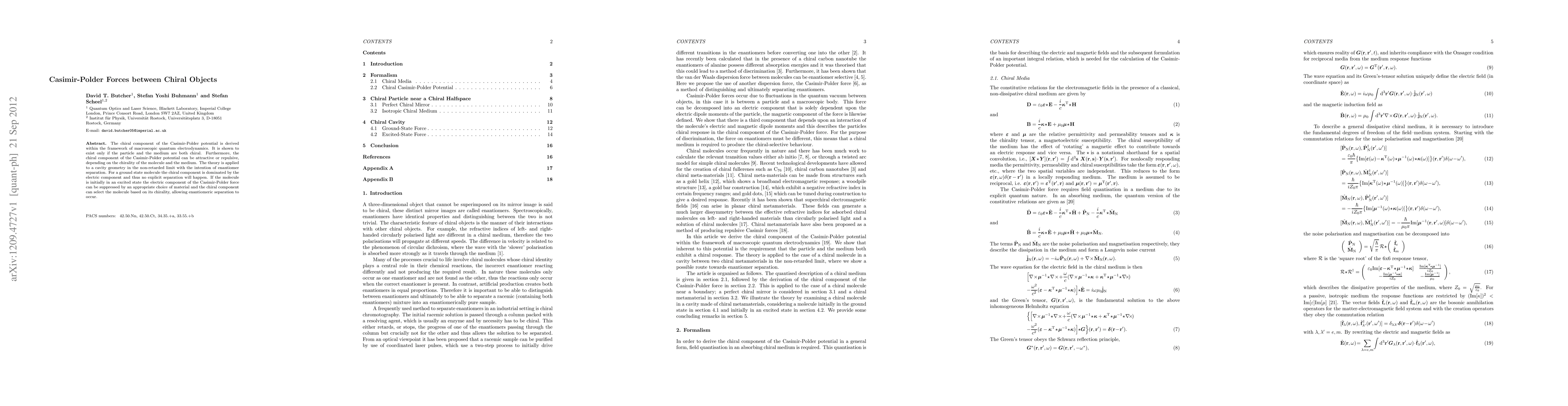 The chiral component of the Casimir-Polder potential is derived within the framework of macroscopic quantum electrodynamics. It is shown to exist only if the particle and the medium are both chiral. Furthermore, the chiral component of the Casimir-Polder potential can be attractive or repulsive, depending on the chirality of the molecule and the medium. The theory is applied to a cavity geometry in the non-retarded limit with the intention of enantiomer separation. For a ground state molecule the chiral component is dominated by the electric component and thus no explicit separation will happen. If the molecule is initially in an excited state the electric component of the Casimir-Polder force can be suppressed by an appropriate choice of material and the chiral component can select the molecule based on its chirality, allowing enantiomeric separation to occur.