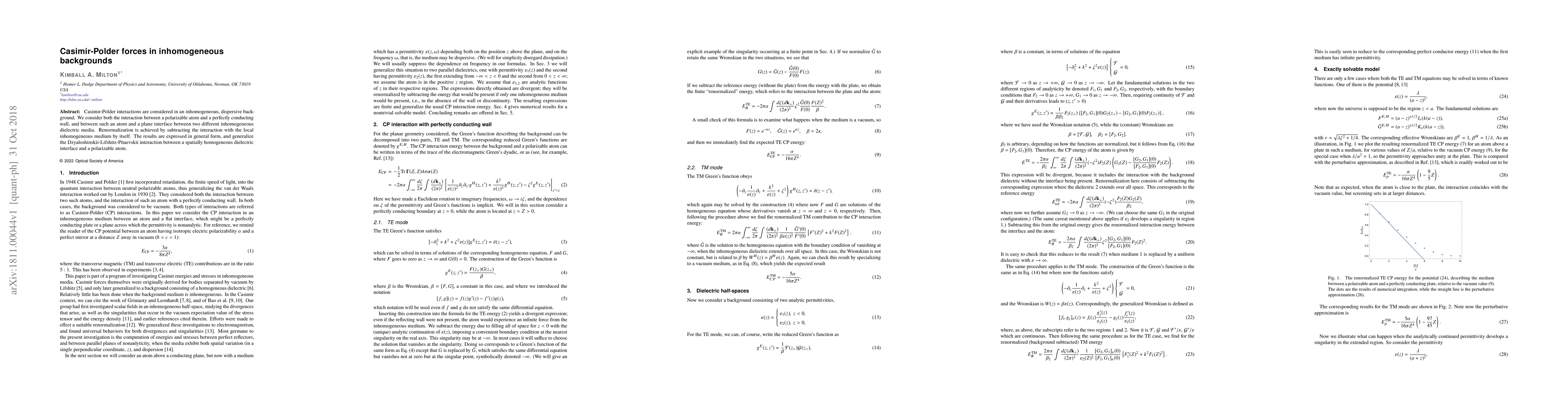 Casimir-Polder interactions are considered in an inhomogeneous, dispersive background. We consider both the interaction between a polarizable atom and a perfectly conducting wall, and between such an atom and a plane interface between two different inhomogeneous dielectric media. Renormalization is achieved by subtracting the interaction with the local inhomogeneous medium by itself. The results are expressed in general form, and generalize the Dzyaloshinskii-Lifshitz-Pitaevskii interaction between a spatially homogeneous dielectric interface and a polarizable atom.