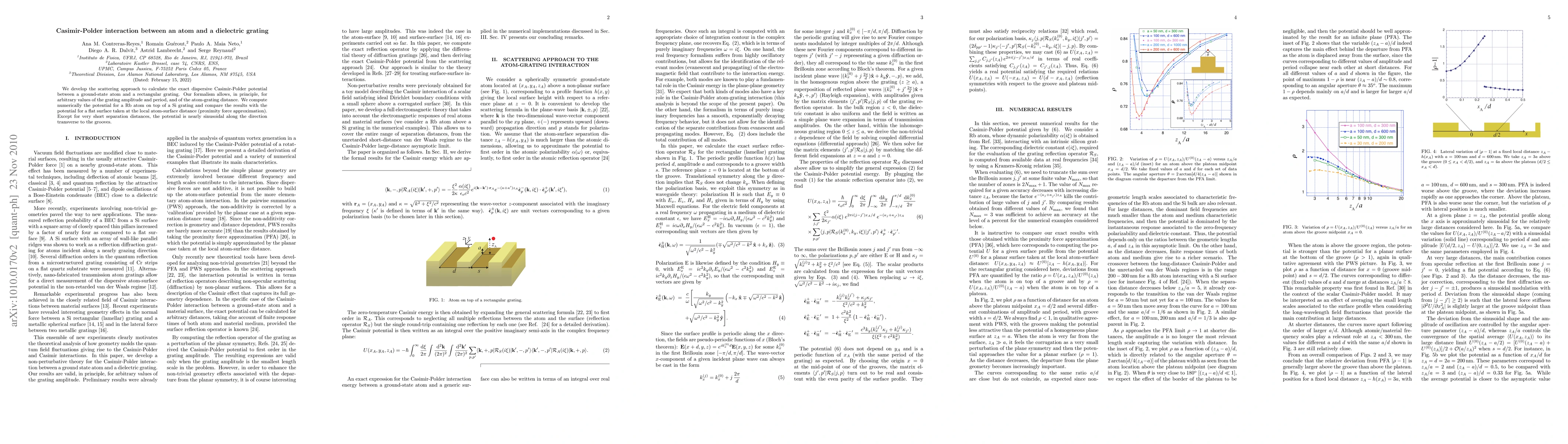 This study calculates the dispersive Casimir-Polder interaction between a ground-state atom and a rectangular dielectric grating using a scattering approach. The results show a nearly sinusoidal potential along the transverse direction, with deviations observed only at very short separation distances.