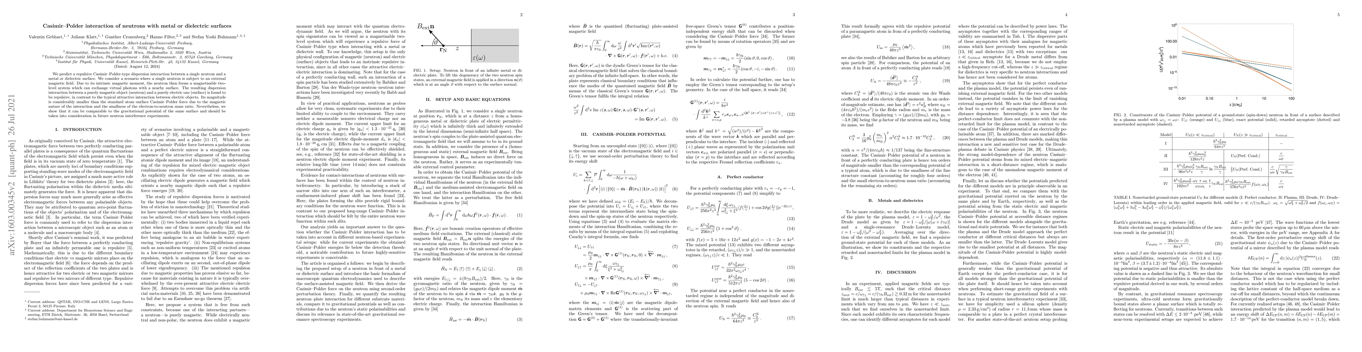 We predict a repulsive Casimir-Polder-type dispersion interaction between a single neutron and a metal or dielectric surface. We consider a scenario where a single neutron is subject to an external magnetic field. Due to its intrinsic magnetic moment, the neutron then forms a magnetisable two-level system which can exchange virtual photons with a nearby surface. The resulting dispersion interaction between a purely magnetic object (neutron) and a purely electric one (surface) is found to be repulsive, in contrast to the typical attractive interaction between electric objects. Its magnitude is considerably smaller than the standard atom--surface Casimir-Polder force due to the magnetic nature of the interaction and the smallness of the electron-to-neutron mass ratio. Nevertheless, we show that it can be comparable to the gravitational potential of the same surface and should be taken into consideration in future neutron interference experiments.