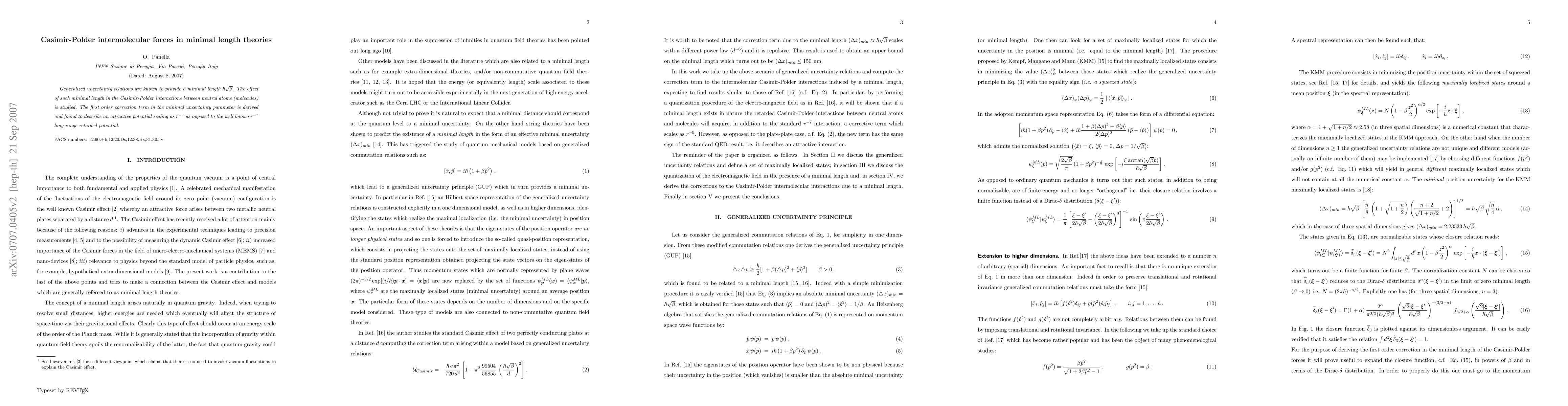 Generalized uncertainty relations are known to provide a minimal length $\hbar\sqrt{\beta}$. The effect of such minimal length in the Casimir-Polder interactions between neutral atoms (molecules) is studied. The first order correction term in the minimal uncertainty parameter is derived and found to describe an attractive potential scaling as $r^{-9}$ as opposed to the well known $r^{-7}$ long range retarded potential.