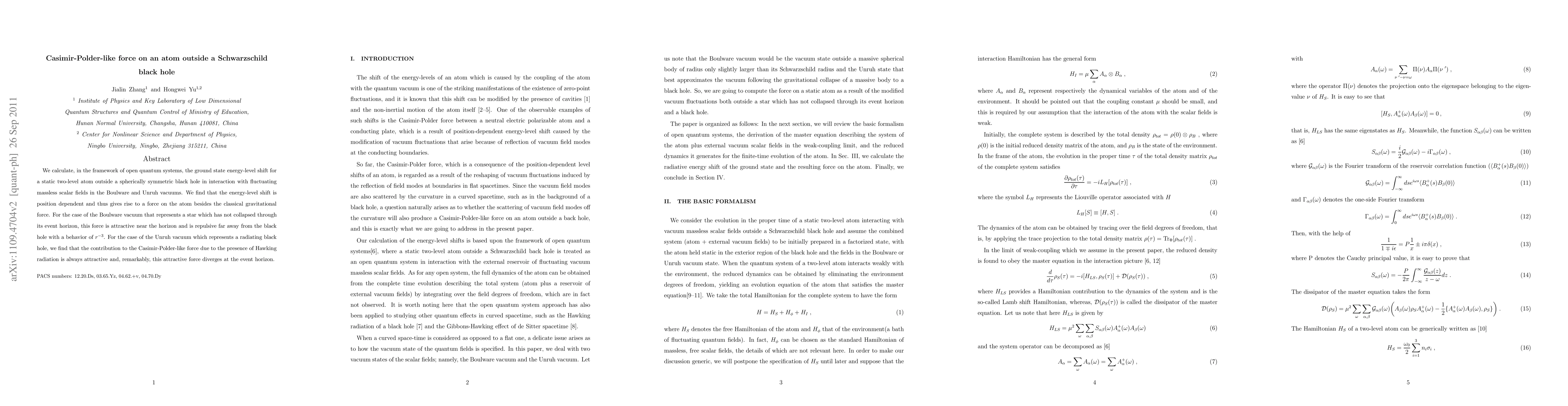 We calculate, in the framework of open quantum systems, the ground state energy-level shift for a static two-level atom outside a spherically symmetric black hole in interaction with fluctuating massless scalar fields in the Boulware and Unruh vacuums. We find that the energy-level shift is position-dependent and thus gives rise to a force on the atom besides the classical gravitational force. For the case of the Boulware vacuum which represents a star that has not collapsed through its event horizon, this force is attractive near the horizon and is repulsive far away from the black hole with a behavior of $r^{-3}$ . For the case of the Unruh vacuum which represents a radiating black hole, we find that the contribution to the Casimir-Polder-like force due to the presence of Hawking radiation is always attractive and, remarkably, this attractive force diverges at the event horizon.