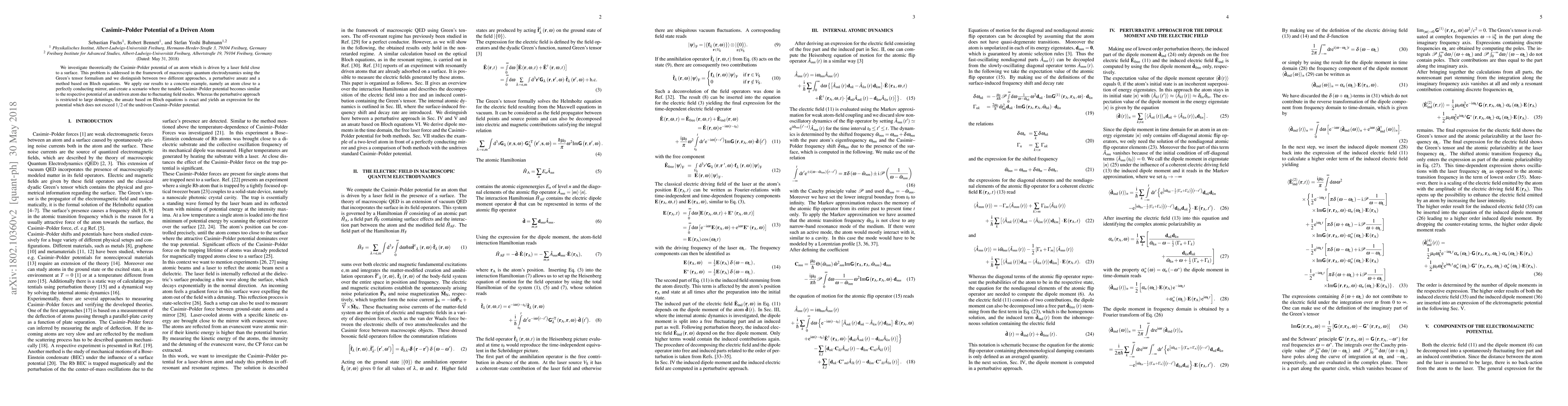 This research theoretically explores the Casimir-Polder potential of a laser-driven atom near a surface, employing macroscopic quantum electrodynamics and Green's tensor formalism. Two methods—perturbative and Bloch equations—are compared, with the latter providing an exact expression for the potential, which is constrained to less than half of the undriven potential.