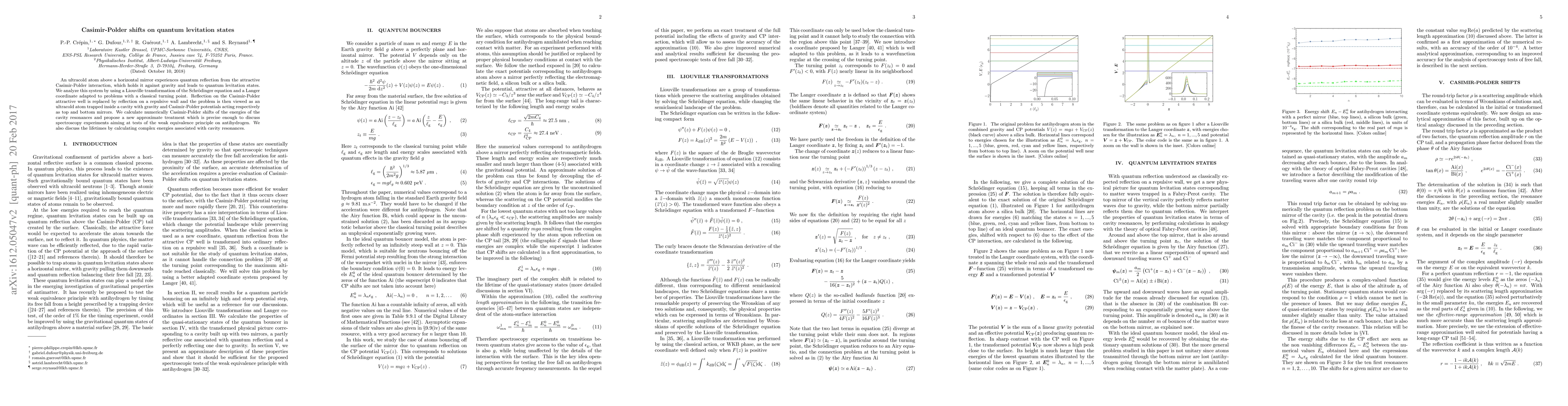 This paper investigates quantum levitation states of ultracold atoms above a mirror due to the Casimir-Polder interaction, using a Liouville transformation and Langer coordinates. It calculates Casimir-Polder shifts in cavity resonances and proposes an approximate method for spectroscopy experiments testing the weak equivalence principle on antihydrogen, while also estimating resonance lifetimes.