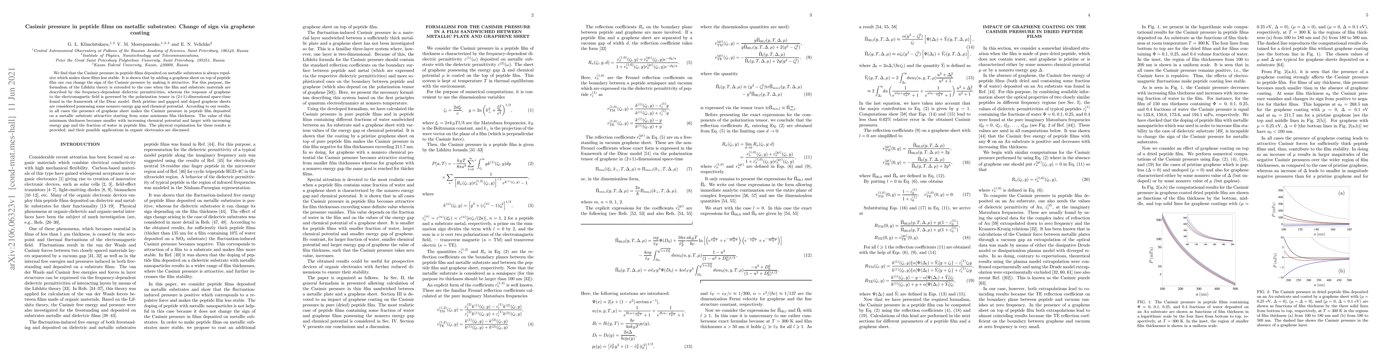 This study demonstrates that the Casimir pressure in peptide films on metallic substrates can be made attractive by coating them with graphene, reversing the repulsive nature of the pressure. The Lifshitz theory is extended to account for frequency-dependent dielectric properties and graphene's polarization tensor, revealing that the minimum film thickness for this effect depends on factors like chemical potential, energy gap, and water content.