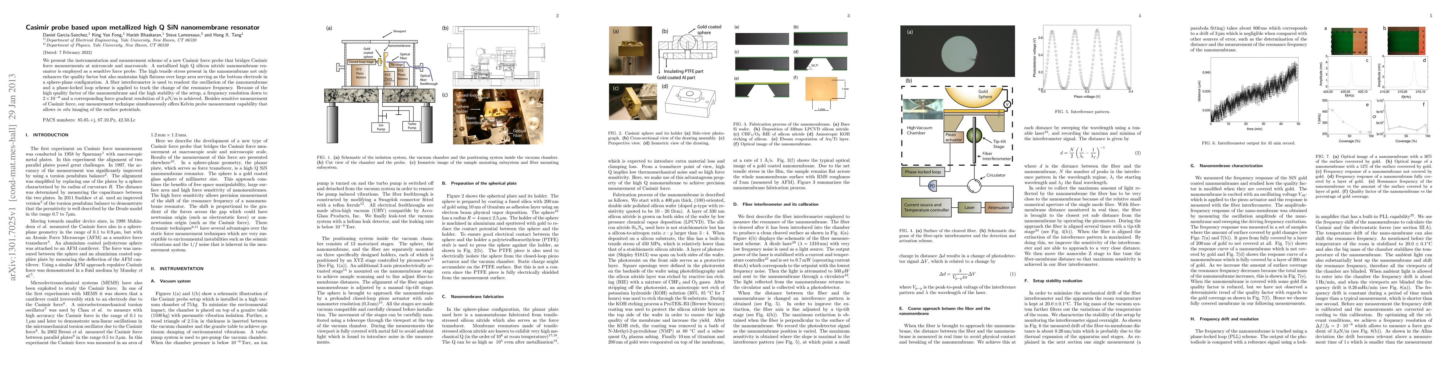 We present the instrumentation and measurement scheme of a new Casimir force probe that bridges Casimir force measurements at microscale and macroscale. A metallized high Q silicon nitride nanomembrane resonator is employed as a sensitive force probe. The high tensile stress present in the nanomembrane not only enhances the quality factor but also maintains high flatness over large area serving as the bottom electrode in a sphere-plane configuration. A fiber interferometer is used to readout the oscillation of the nanomembrane and a phase-locked loop scheme is applied to track the change of the resonance frequency. Because of the high quality factor of the nanomembrane and the high stability of the setup, a frequency resolution down to $2\times10^{-9}$ and a corresponding force gradient resolution of 3 $\mu$N/m is achieved. Besides sensitive measurement of Casimir force, our measurement technique simultaneously offers Kelvin probe measurement capability that allows in situ imaging of the surface potentials.