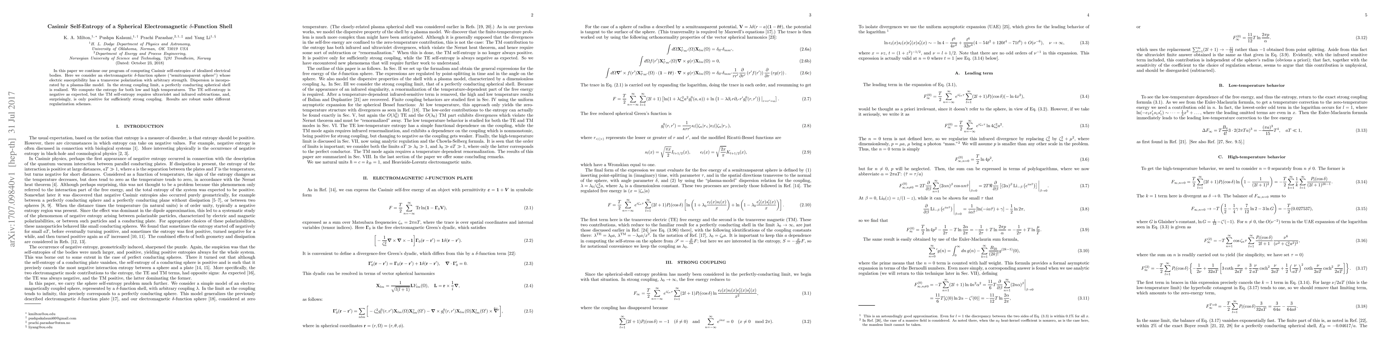 In this paper we continue our program of computing Casimir self-entropies of idealized electrical bodies. Here we consider an electromagnetic $\delta$-function sphere ("semitransparent sphere") whose electric susceptibility has a transverse polarization with arbitrary strength. Dispersion is incorporated by a plasma-like model. In the strong coupling limit, a perfectly conducting spherical shell is realized. We compute the entropy for both low and high temperatures. The TE self-entropy is negative as expected, but the TM self-entropy requires ultraviolet and infrared subtractions, and, surprisingly, is only positive for sufficiently strong coupling. Results are robust under different regularization schemes.