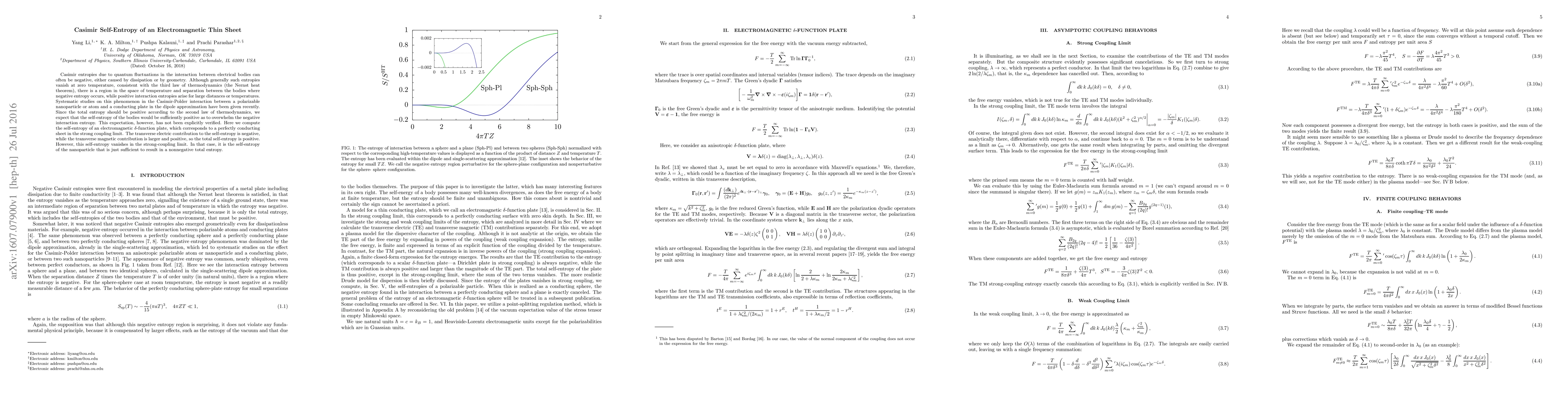 Casimir entropies due to quantum fluctuations in the interaction between electrical bodies can often be negative, either caused by dissipation or by geometry. Although generally such entropies vanish at zero temperature, consistent with the third law of thermodynamics (the Nernst heat theorem), there is a region in the space of temperature and separation between the bodies where negative entropy occurs, while positive interaction entropies arise for large distances or temperatures. Systematic studies on this phenomenon in the Casimir-Polder interaction between a polarizable nanoparticle or atom and a conducting plate in the dipole approximation have been given recently. Since the total entropy should be positive according to the second law of thermodynamics, we expect that the self-entropy of the bodies would be sufficiently positive as to overwhelm the negative interaction entropy. This expectation, however, has not been explicitly verified. Here we compute the self-entropy of an electromagnetic $\delta$-function plate, which corresponds to a perfectly conducting sheet in the strong coupling limit. The transverse electric contribution to the self-entropy is negative, while the transverse magnetic contribution is larger and positive, so the total self-entropy is positive. However, this self-entropy vanishes in the strong-coupling limit. In that case, it is the self-entropy of the nanoparticle that is just sufficient to result in a nonnegative total entropy.