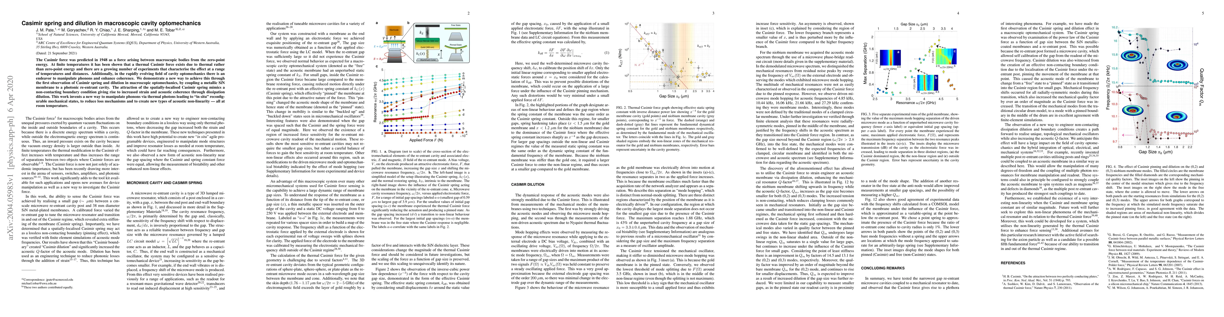 This paper reports the first observation of a Casimir spring and dilution in macroscopic cavity optomechanics, achieved by coupling a metallic SiN membrane to a photonic re-entrant cavity. The study demonstrates enhanced acoustic coherence and phonon manipulation through thermal Casimir forces at room temperature, offering a new method for reducing loss mechanisms and creating new acoustic non-linearities.